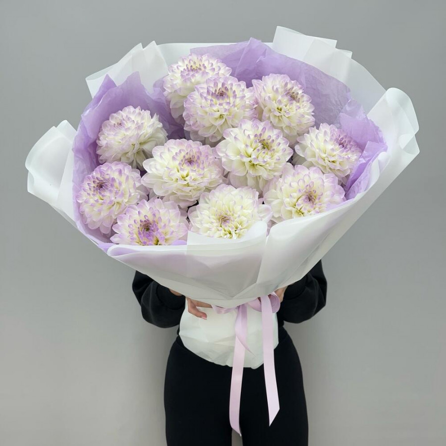 На фото букет из 11 белых георгин. В составе: георгина 11 шт, дизайнерская упаковка 1 шт, атласная лента 1 шт, . Все цветы свежие и ароматные, букет красиво оформлен и отлично подходит для подарка. Доступна доставка цветов или самовывоз.
