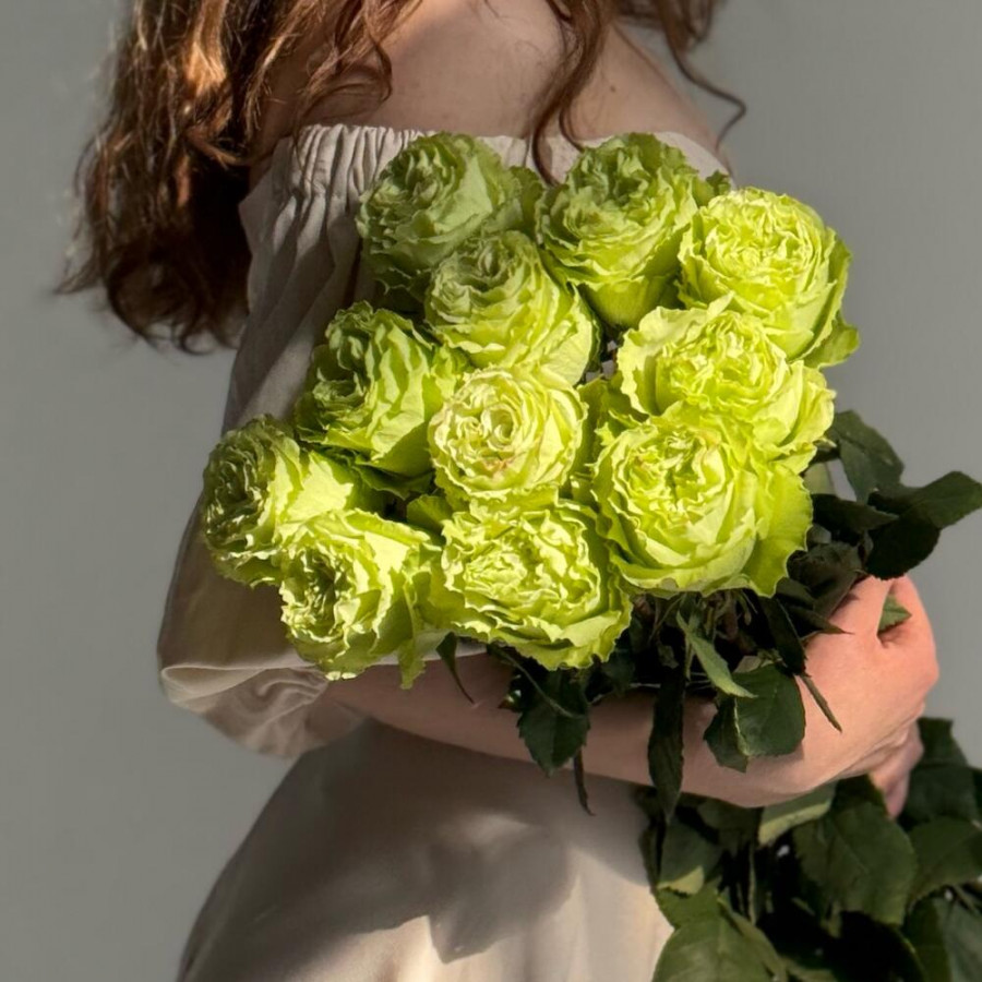 На фото букет из 11 зеленых роз. В составе: пионовидная роза 11 шт, атласная лента 1 шт, . Все цветы свежие и ароматные, букет красиво оформлен и отлично подходит для подарка. Доступна доставка цветов или самовывоз.