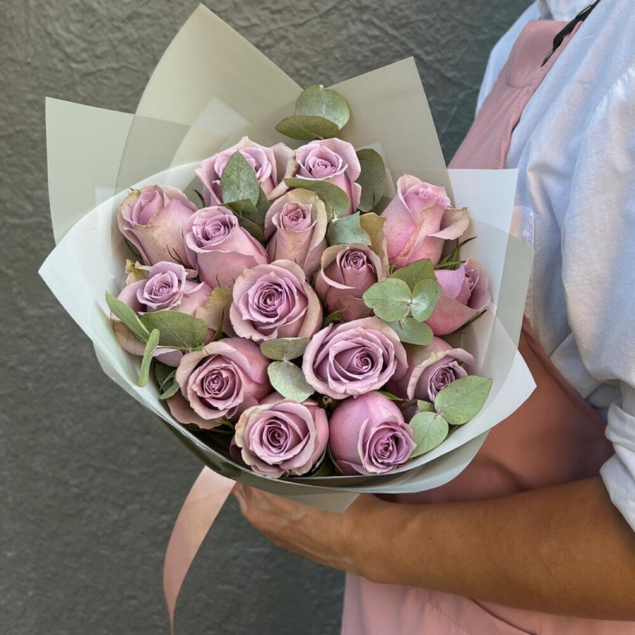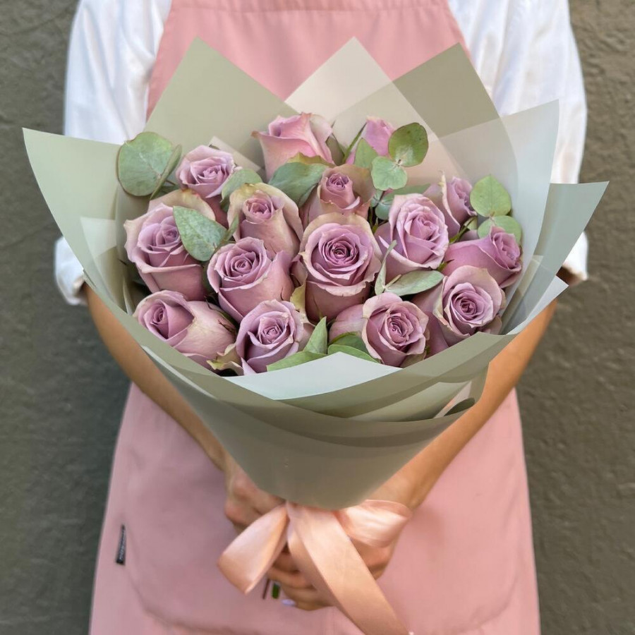 На фото букет из 15 фиолетовых роз. В составе: роза 15 шт, дизайнерская упаковка 1 шт, атласная лента 1 шт, . Все цветы свежие и ароматные, букет красиво оформлен и отлично подходит для подарка. Доступна доставка цветов или самовывоз.