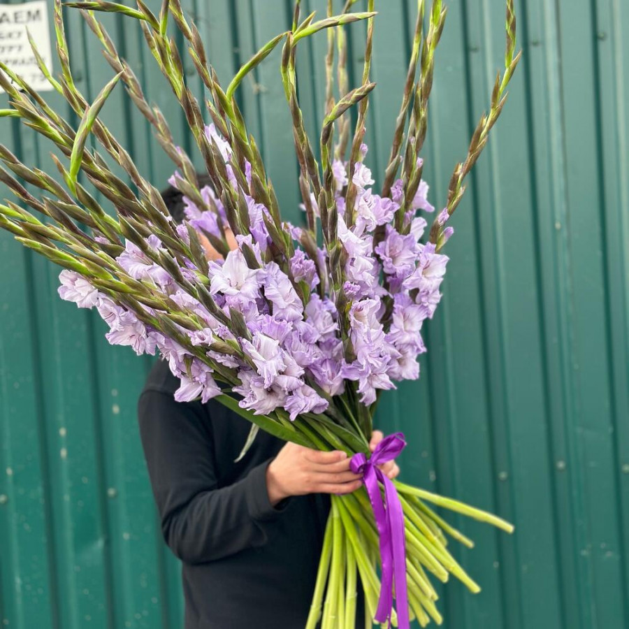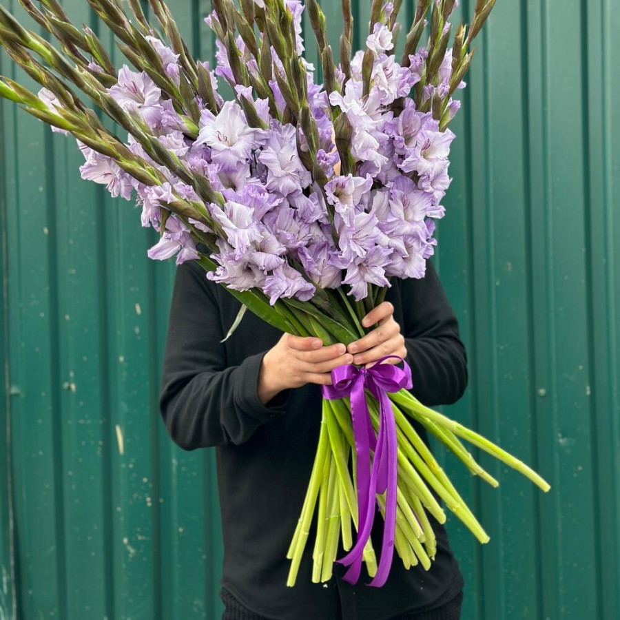 На фото букет из 25 сиреневых гладиолусов. В составе: гладиолус 25 шт, атласная лента 1 шт, . Все цветы свежие и ароматные, букет красиво оформлен и отлично подходит для подарка. Доступна доставка цветов или самовывоз.
