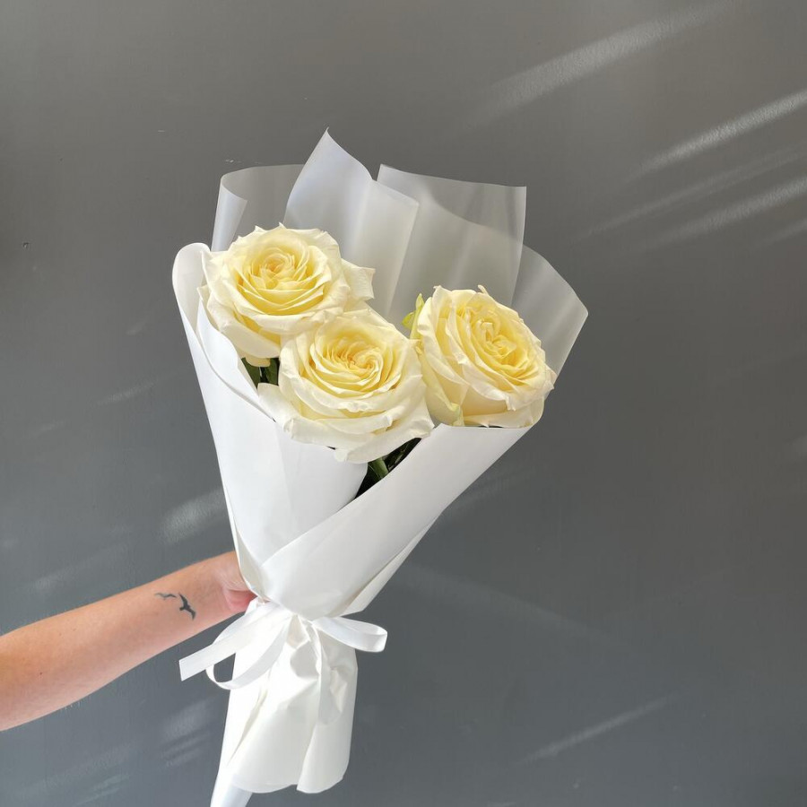 На фото букет из 3 кремовых роз. В составе: роза 3 шт, дизайнерская упаковка 1 шт, атласная лента 1 шт, . Все цветы свежие и ароматные, букет красиво оформлен и отлично подходит для подарка. Доступна доставка цветов или самовывоз.