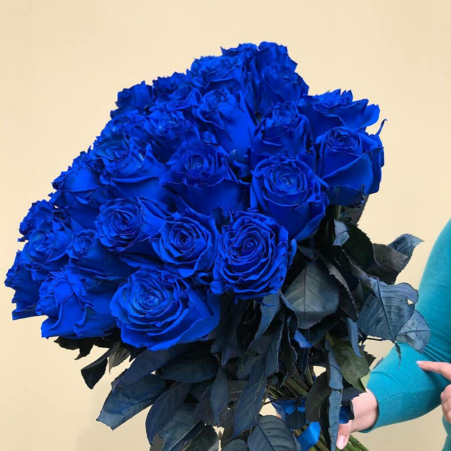 31 насыщенно-синяя роза в аккуратной голубой упаковке, лента в тон. Длина стебля на выбор: 45 или 70 см.