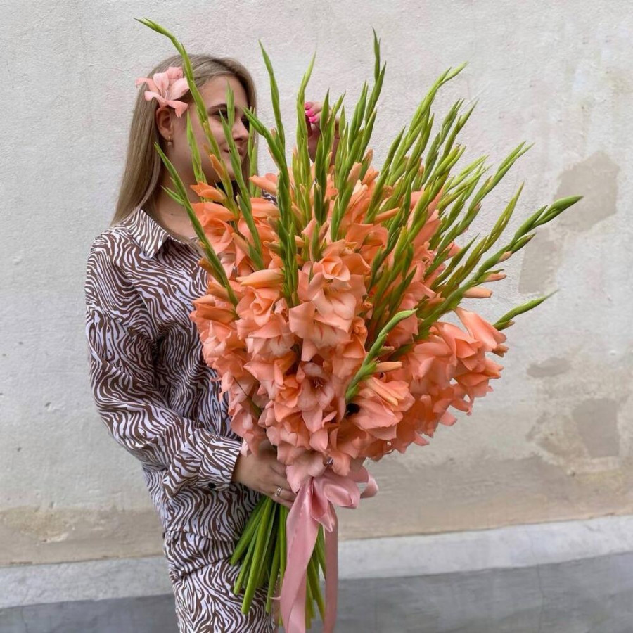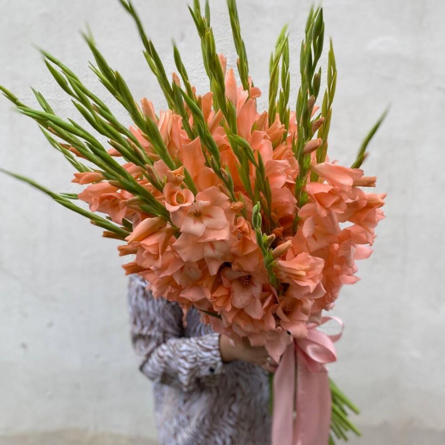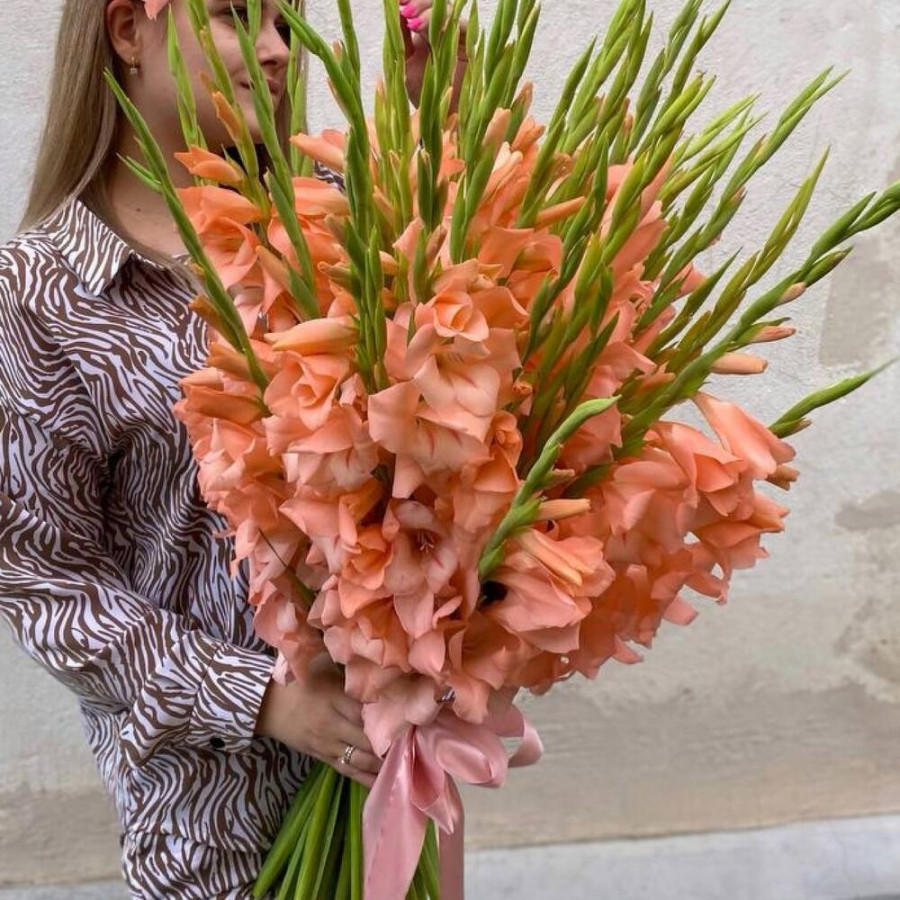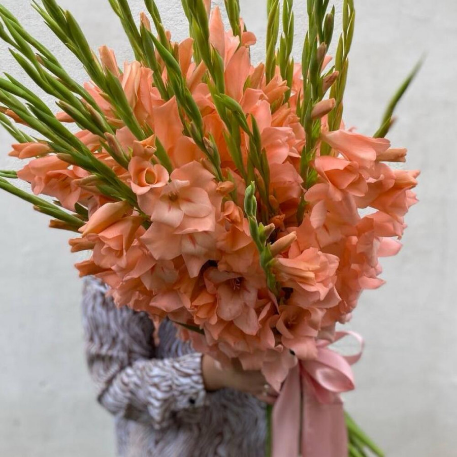 На фото букет из 35 персиковых гладиолусов. В составе: гладиолус 35 шт, атласная лента 2 шт, . Все цветы свежие и ароматные, букет красиво оформлен и отлично подходит для подарка. Доступна доставка цветов или самовывоз.