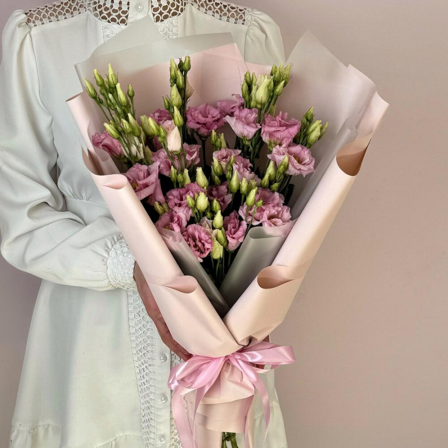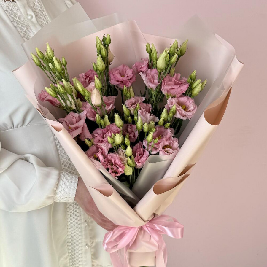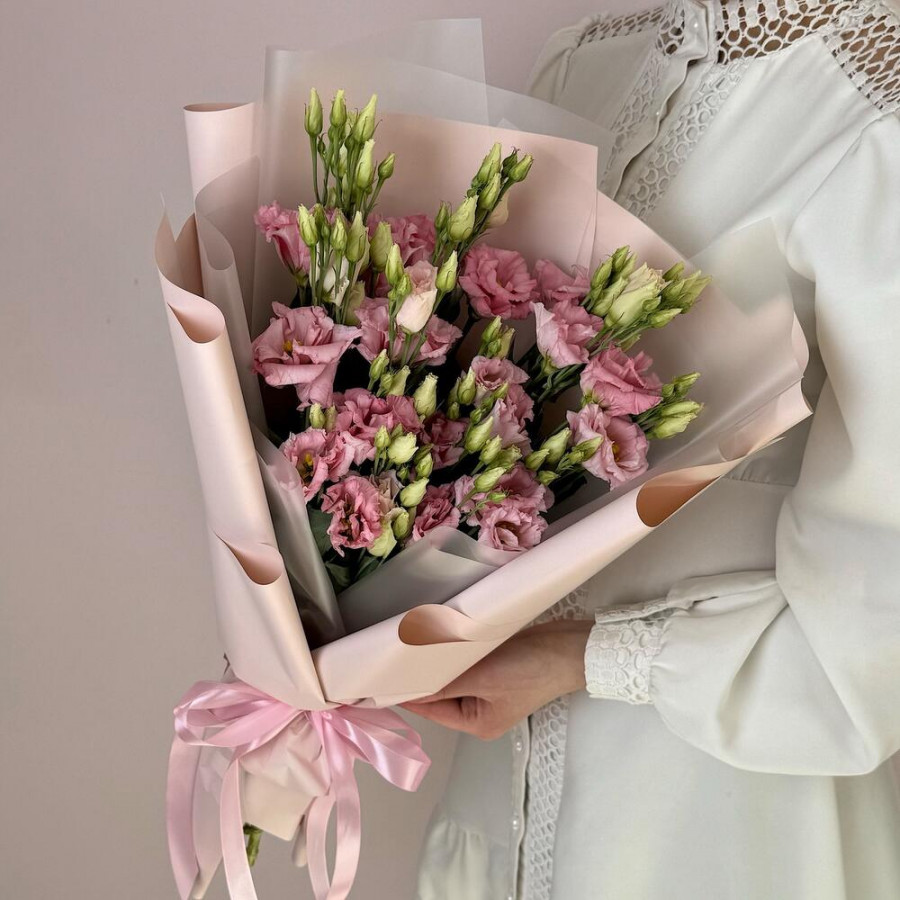 На фото букет 5 розовых эустом. В составе: эустома (лизиантус) 5 шт, дизайнерская упаковка 1 шт, атласная лента 2 шт, . Все цветы свежие и ароматные, букет красиво оформлен и отлично подходит для подарка. Доступна доставка цветов или самовывоз.