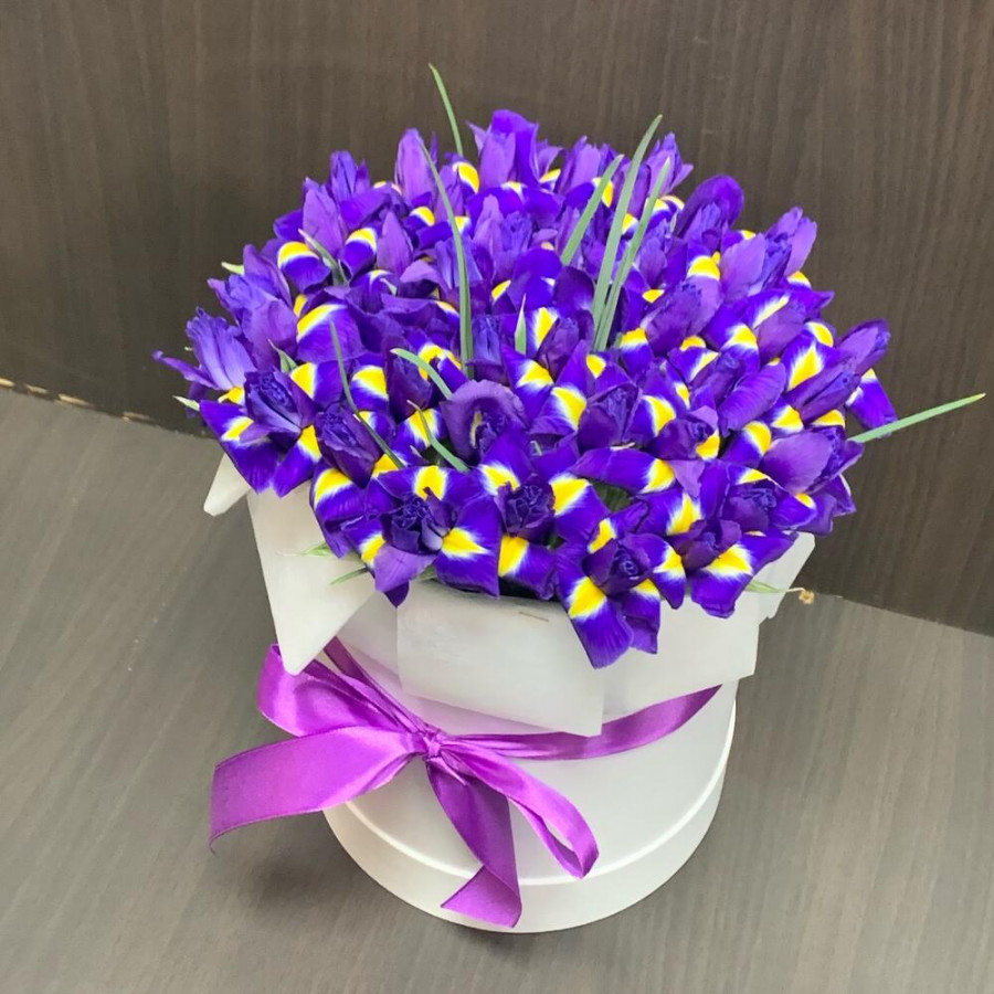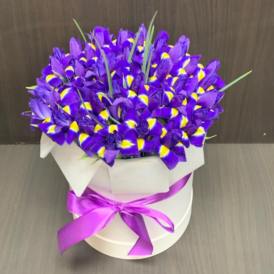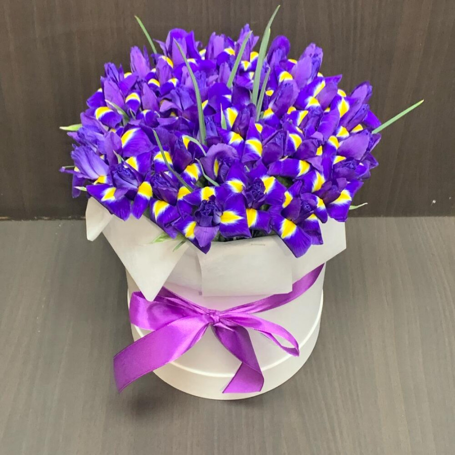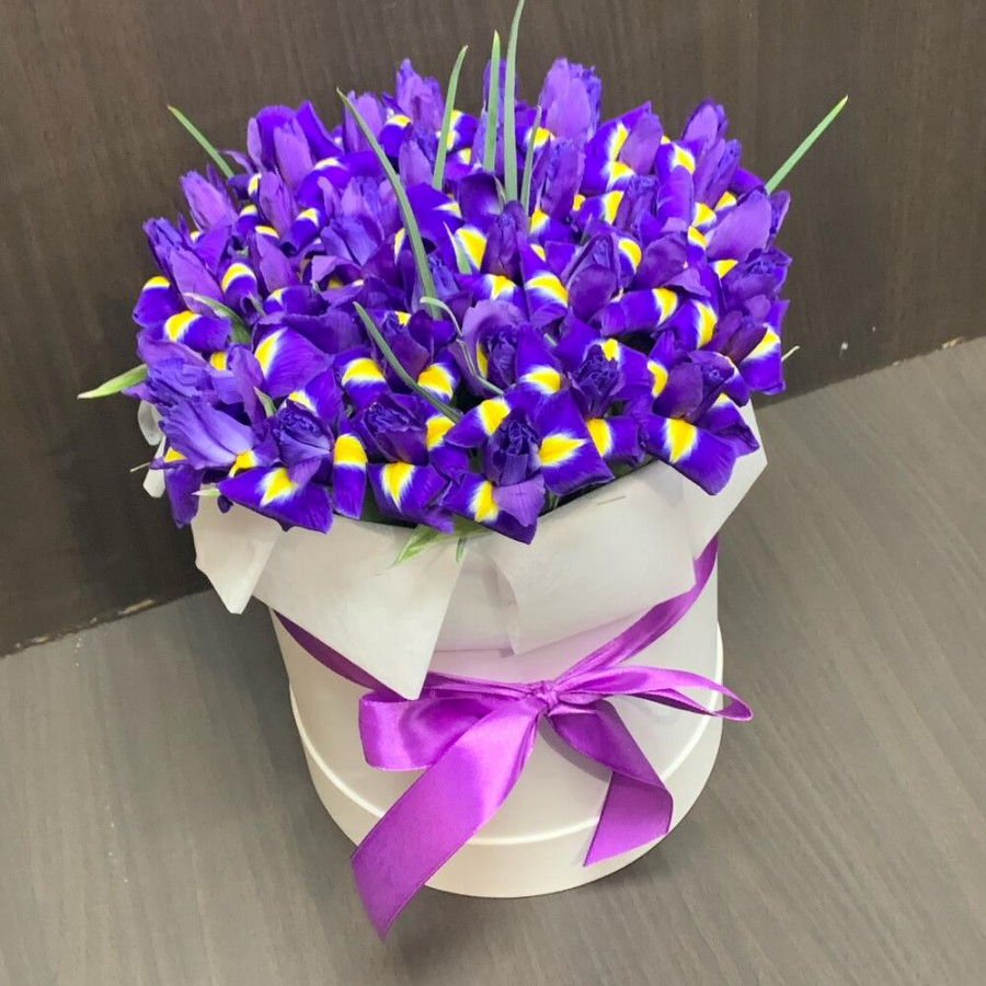 51 фиолетовый ирис в шляпной коробке в Переславле-Залесском