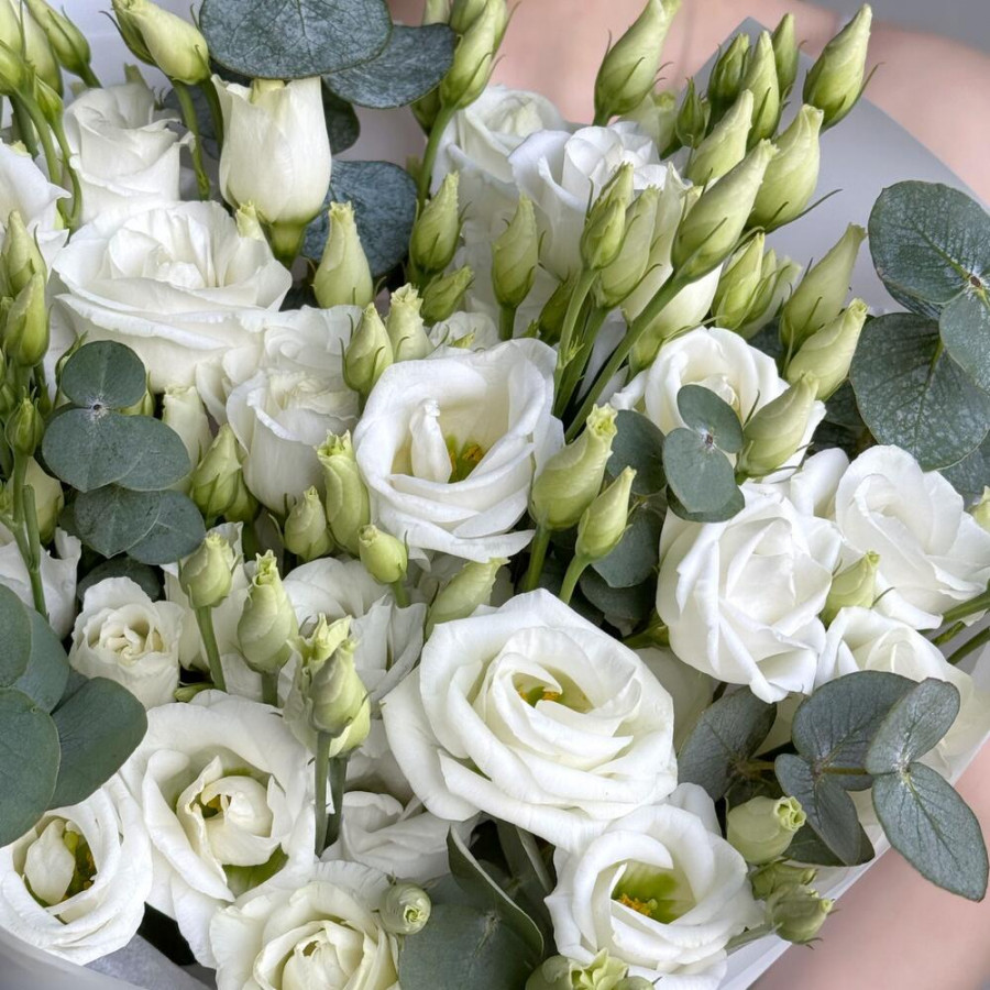 На фото букет из 7 белых эустом и эвкалипта. В составе: эустома (лизиантус) 7 шт, эвкалипт 4 шт, дизайнерская упаковка 1 шт, атласная лента 1 шт, . Все цветы свежие и ароматные, букет красиво оформлен и отлично подходит для подарка. Доступна доставка цветов или самовывоз.
