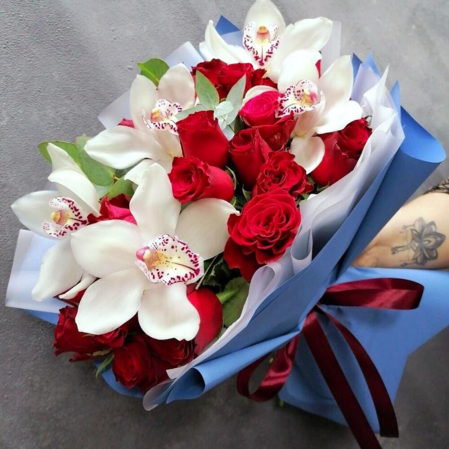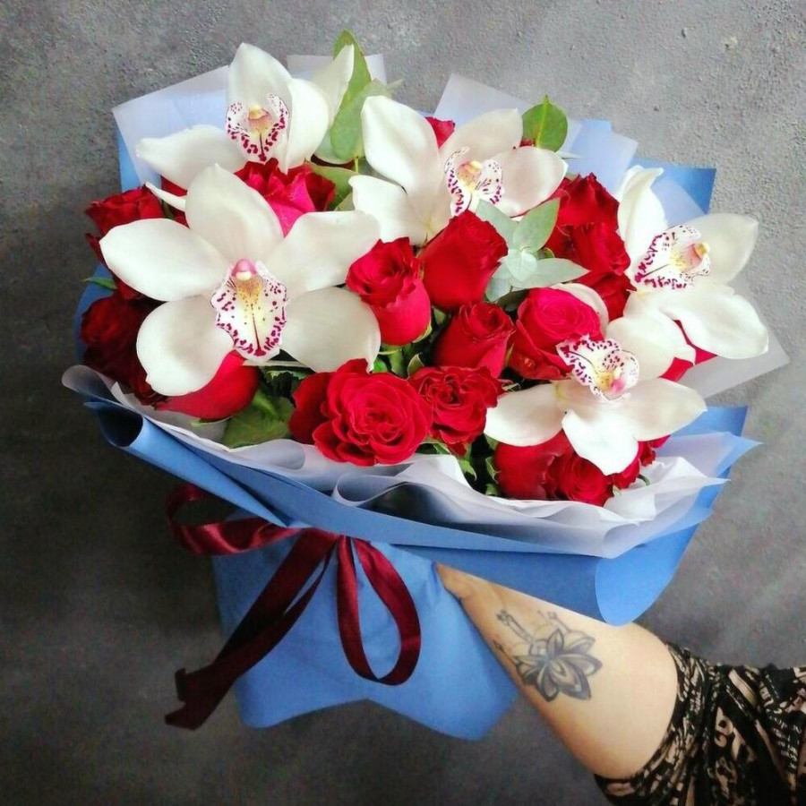 На фото букет «алое вдохновение». В составе: орхидея 5 шт, роза 21 шт, зелень 5 шт, дизайнерская упаковка 2 шт, атласная лента 1 шт, . Все цветы свежие и ароматные, букет красиво оформлен и отлично подходит для подарка. Доступна доставка цветов или самовывоз.