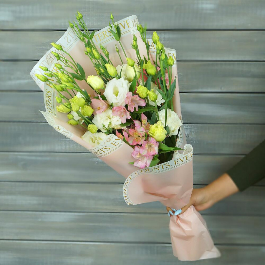 На фото букет из розовых альстромерий и белых эустом. В составе: альстромерия 3 шт, эустома (лизиантус) 5 шт, дизайнерская упаковка 1 шт, атласная лента 1 шт, . Все цветы свежие и ароматные, букет красиво оформлен и отлично подходит для подарка. Доступна доставка цветов или самовывоз.