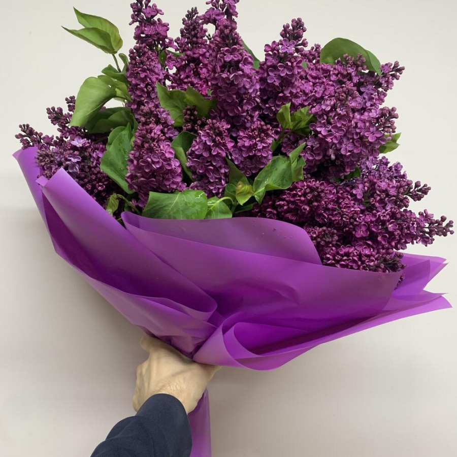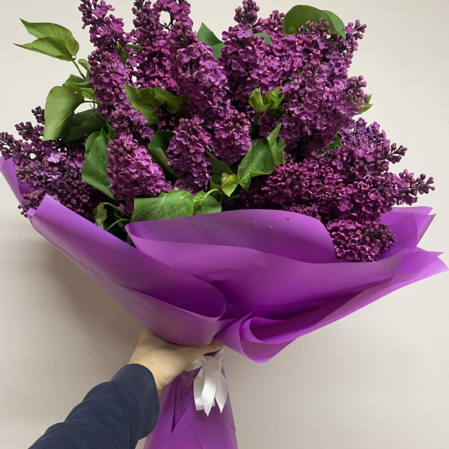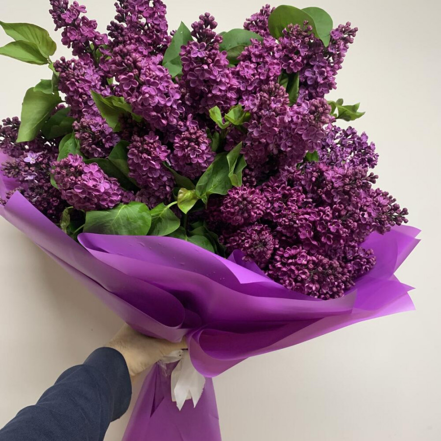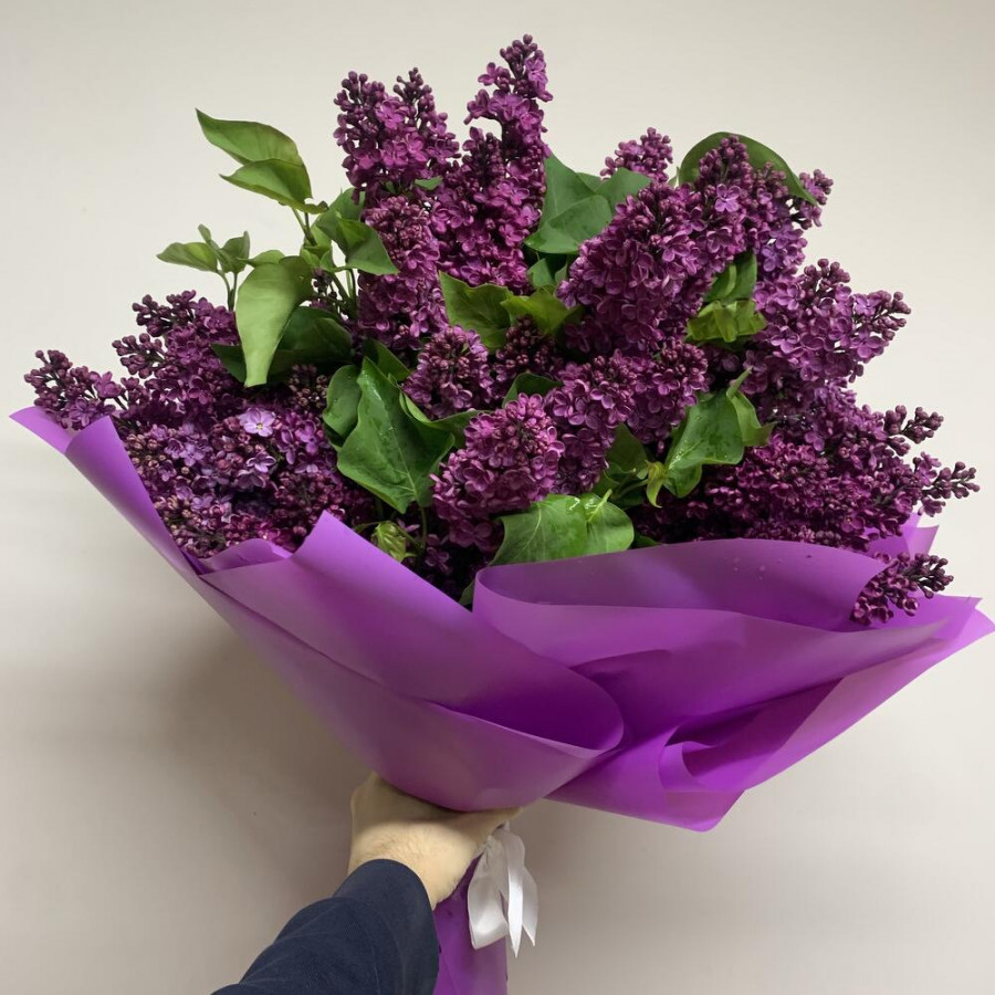 На фото букет цветов из сирени. В составе: сирень 13 шт, крафт-бумага 1 шт, атласная лента 1 шт, . Все цветы свежие и ароматные, букет красиво оформлен и отлично подходит для подарка. Доступна доставка цветов или самовывоз.
