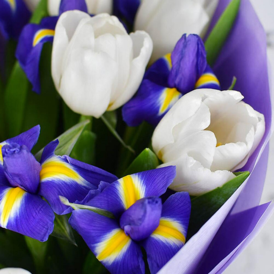 Букет из синих ирисов и белых тюльпанов