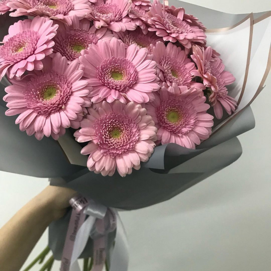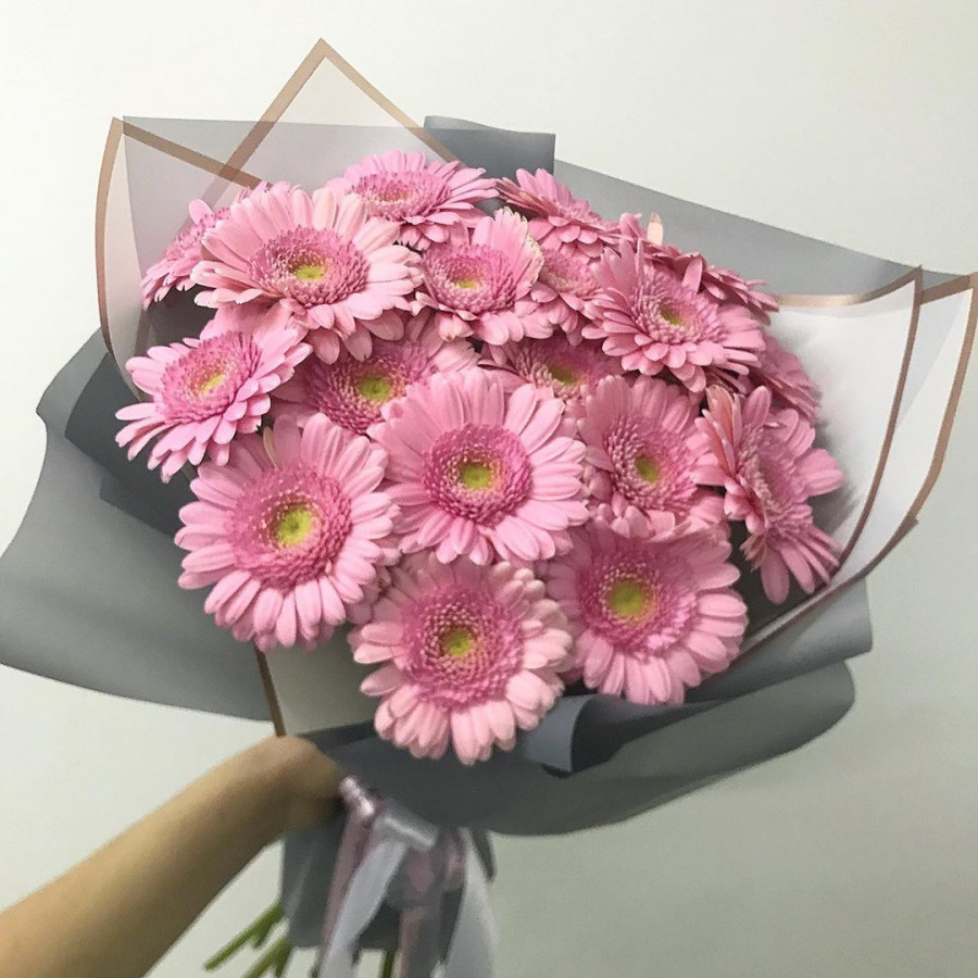 На фото букет из 19 розовых гербер. В составе: гербера 19 шт, крафт-бумага 1 шт, атласная лента 1 шт, . Все цветы свежие и ароматные, букет красиво оформлен и отлично подходит для подарка. Доступна доставка цветов или самовывоз.