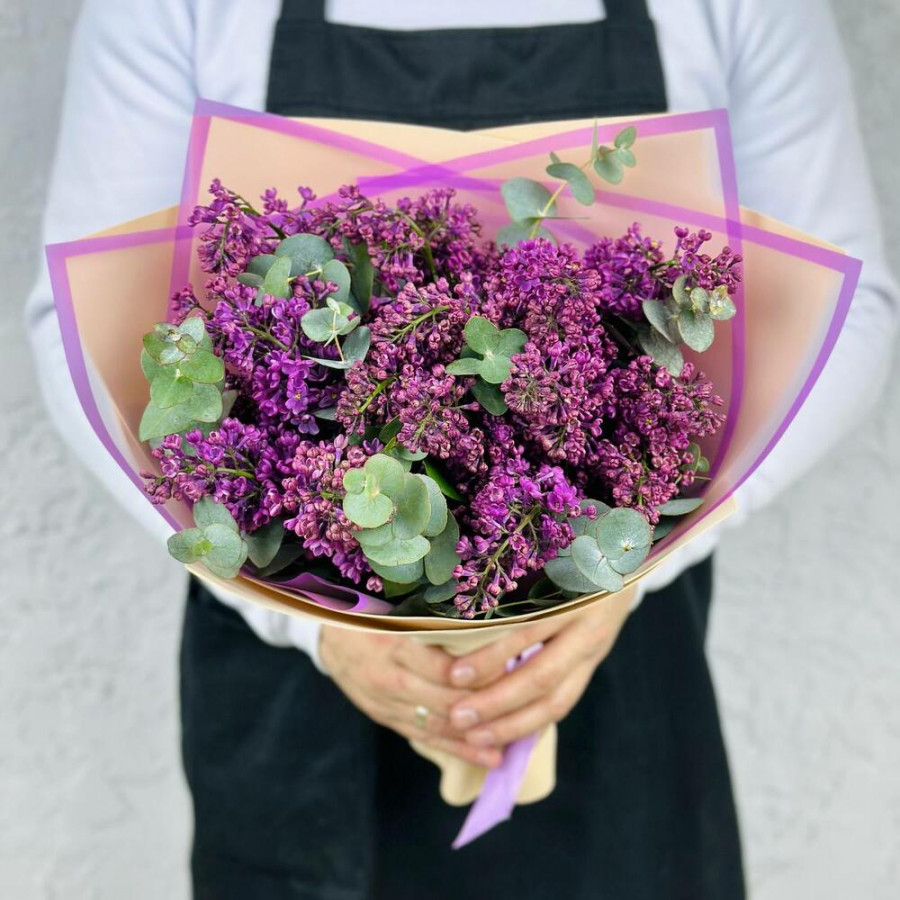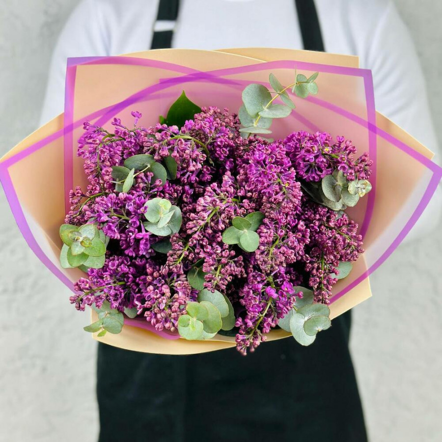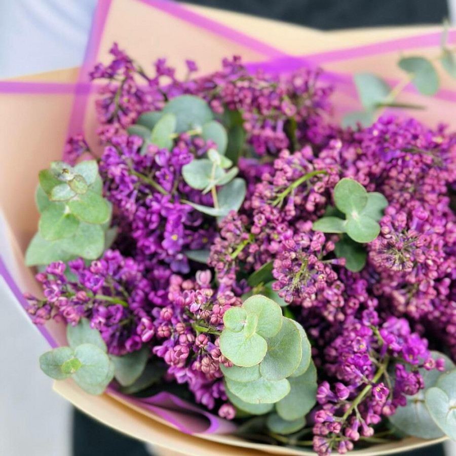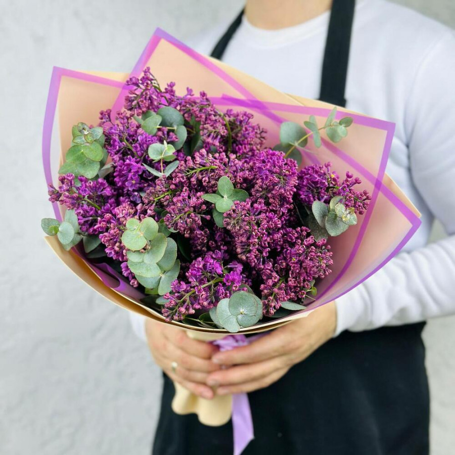 На фото букет из 5 веток сирени. В составе: сирень 5 шт, эвкалипт 5 шт, крафт-бумага 1 шт, атласная лента 1 шт, . Все цветы свежие и ароматные, букет красиво оформлен и отлично подходит для подарка. Доступна доставка цветов или самовывоз.