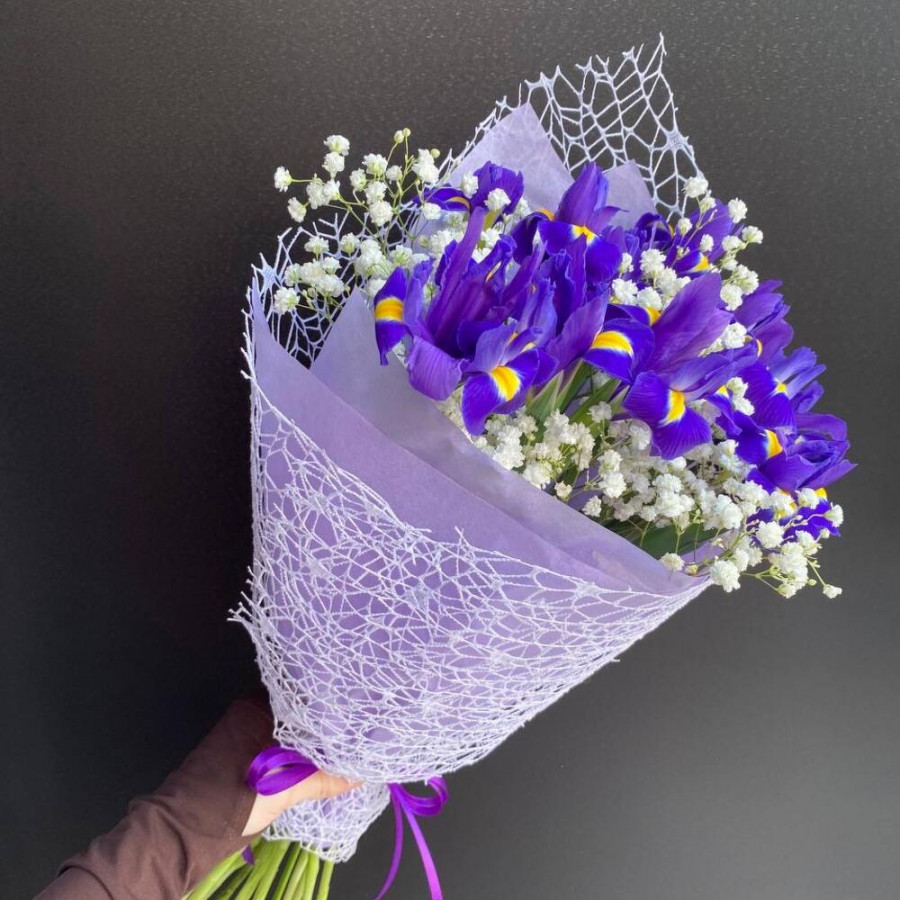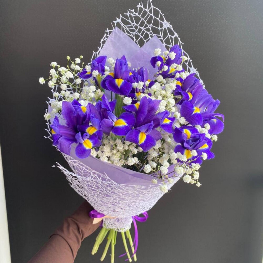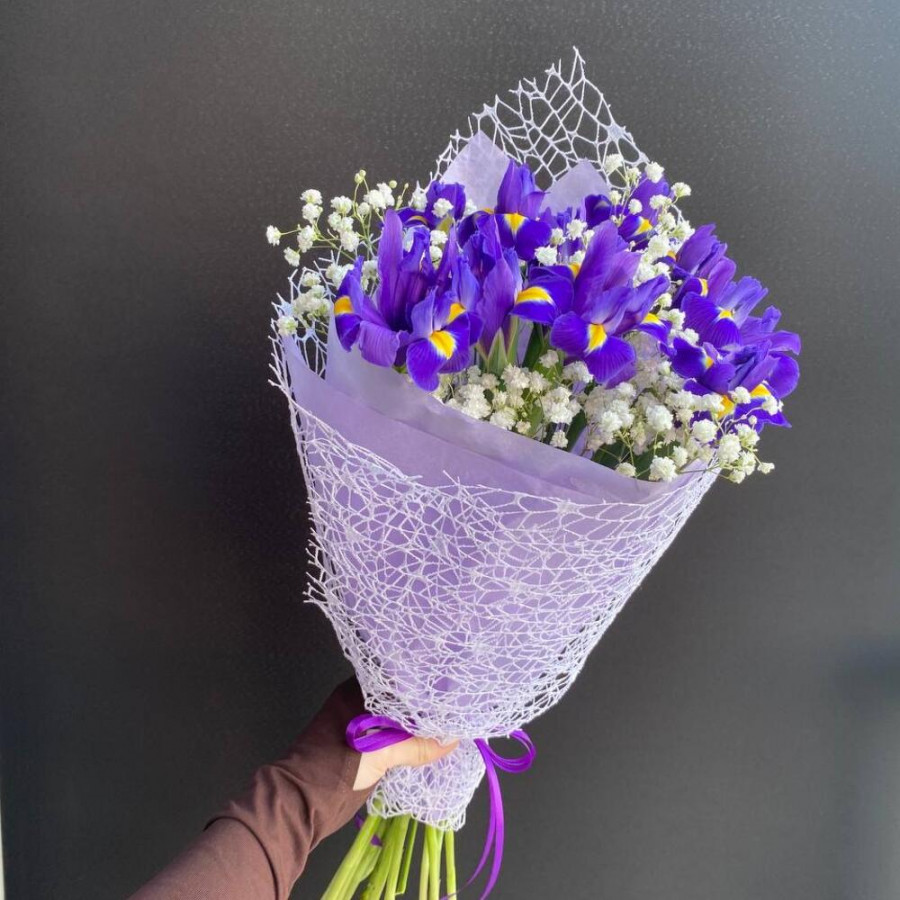 На фото букет из фиолетовых ирисов и белой гипсофилы. В составе: ирис 11 шт, гипсофила 2 шт, дизайнерская упаковка 1 шт, атласная лента 1 шт, . Все цветы свежие и ароматные, букет красиво оформлен и отлично подходит для подарка. Доступна доставка цветов или самовывоз.