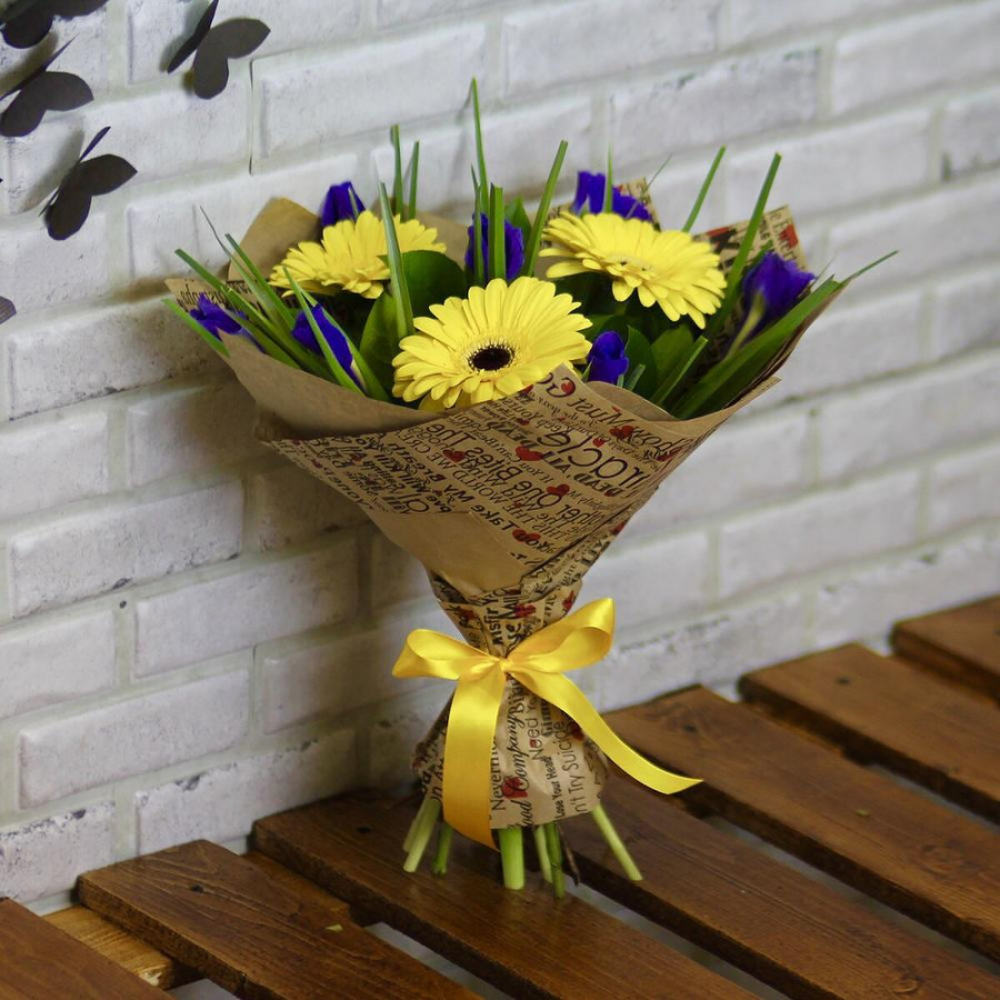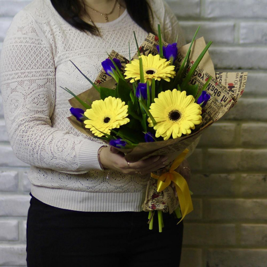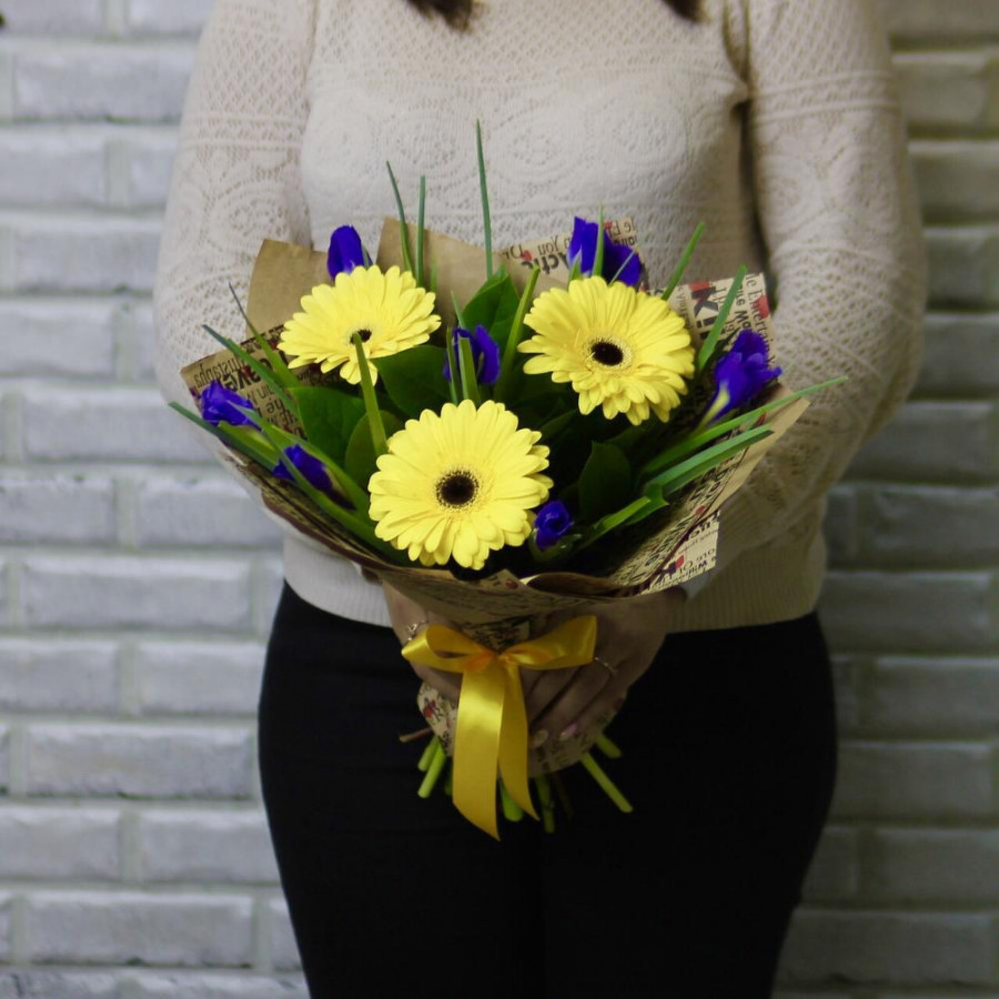Букет из желтых гербер с синими ирисами в Переславле-Залесском