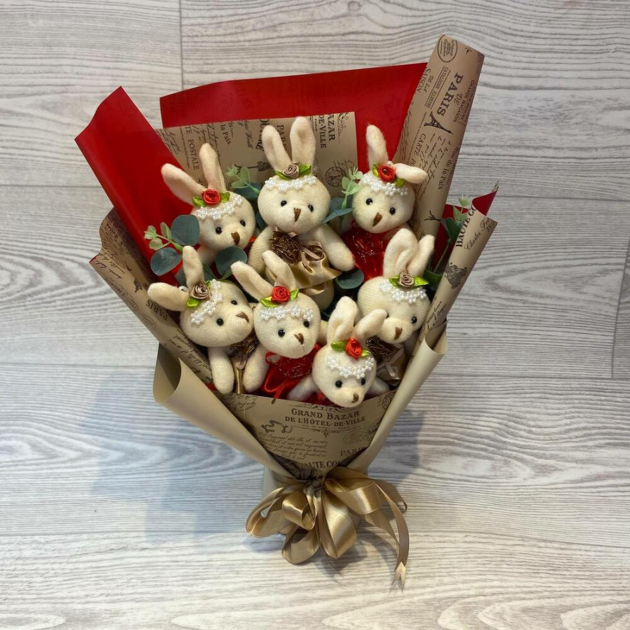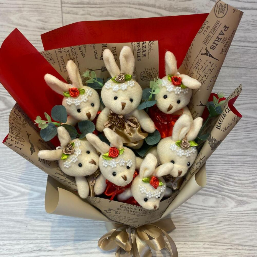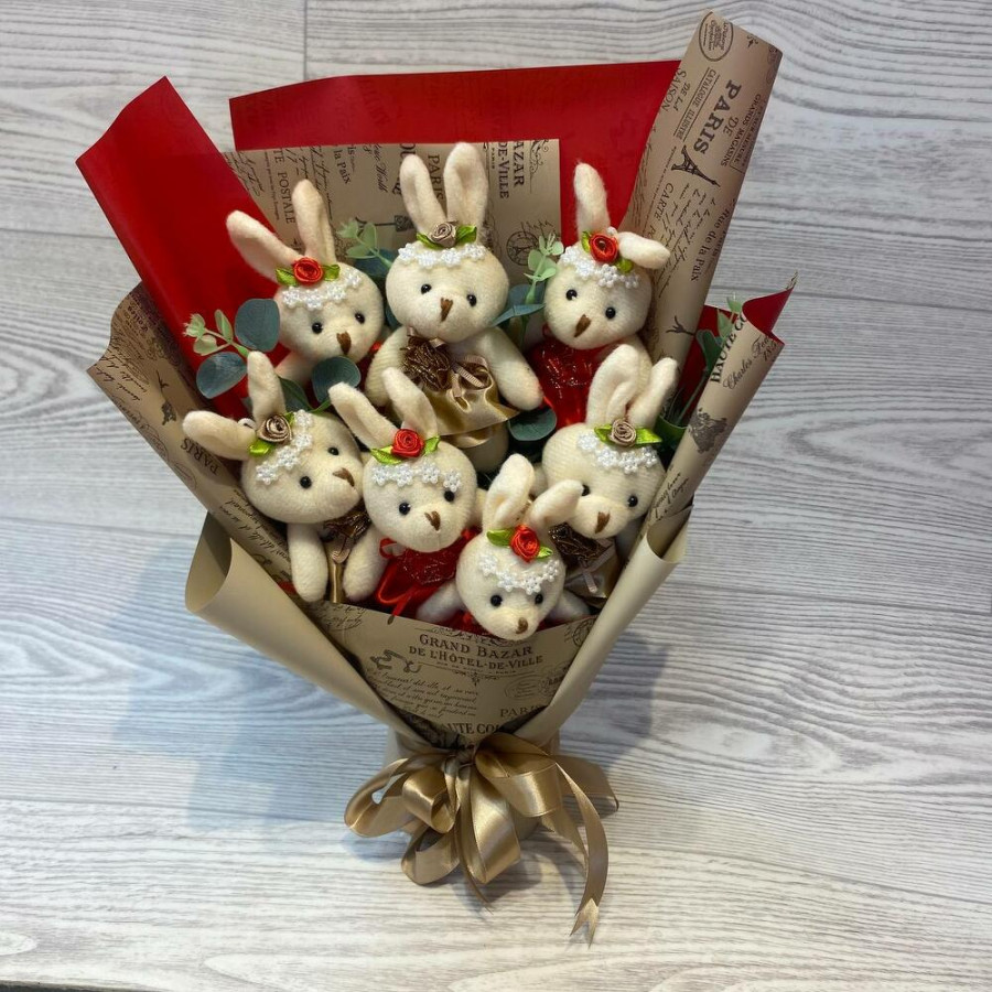 На фото букет из игрушек «зайки» 7 шт.. В составе: . Все цветы свежие и ароматные, букет красиво оформлен и отлично подходит для подарка. Доступна доставка цветов или самовывоз.