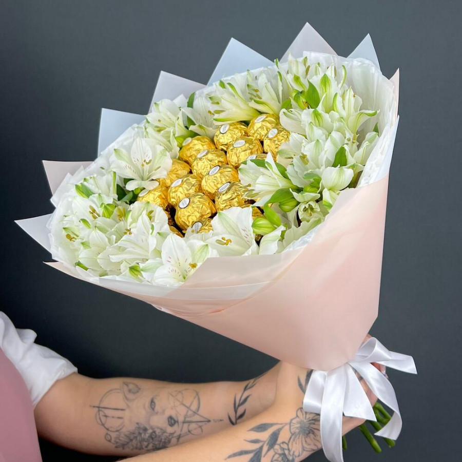 Букет из конфет Ferrero Rocher и и альстромерии
