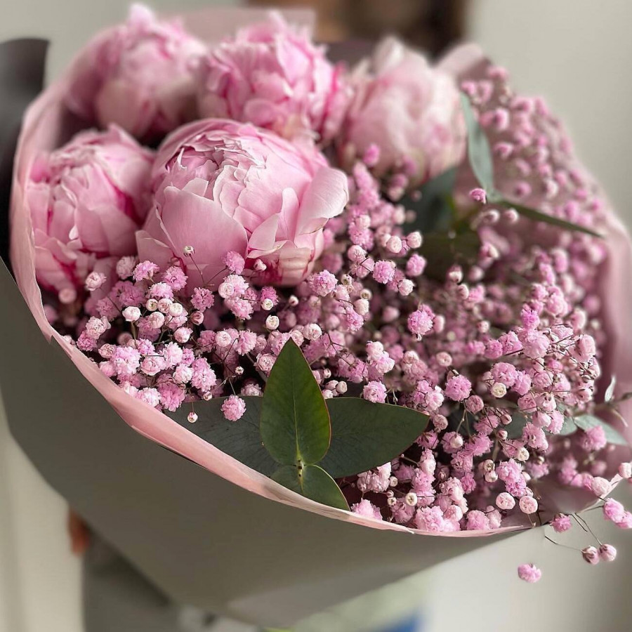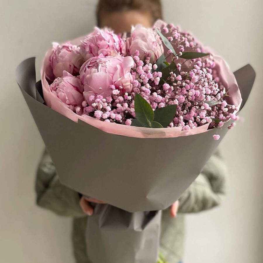 На фото букет из пионов и гипсофилы. В составе: пион 5 шт, гипсофила 4 шт, эвкалипт 1 шт, крафт-бумага 1 шт, . Все цветы свежие и ароматные, букет красиво оформлен и отлично подходит для подарка. Доступна доставка цветов или самовывоз.