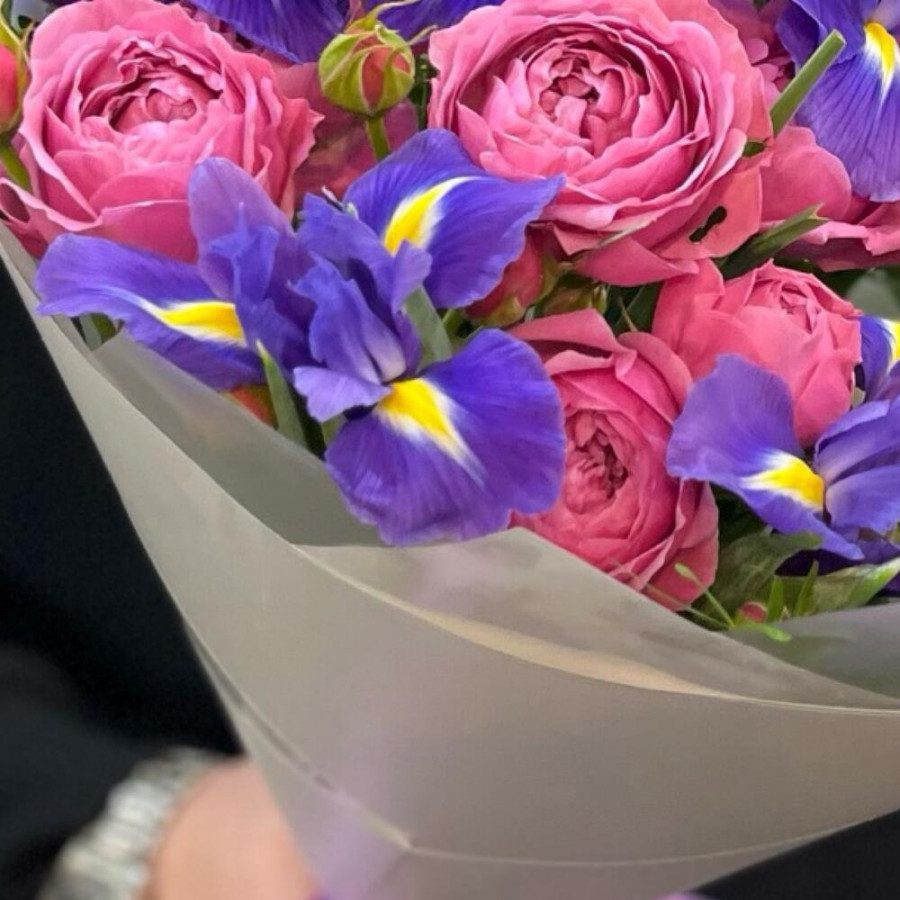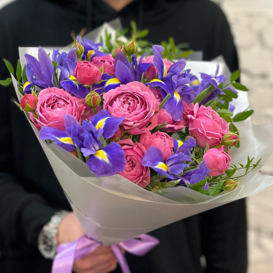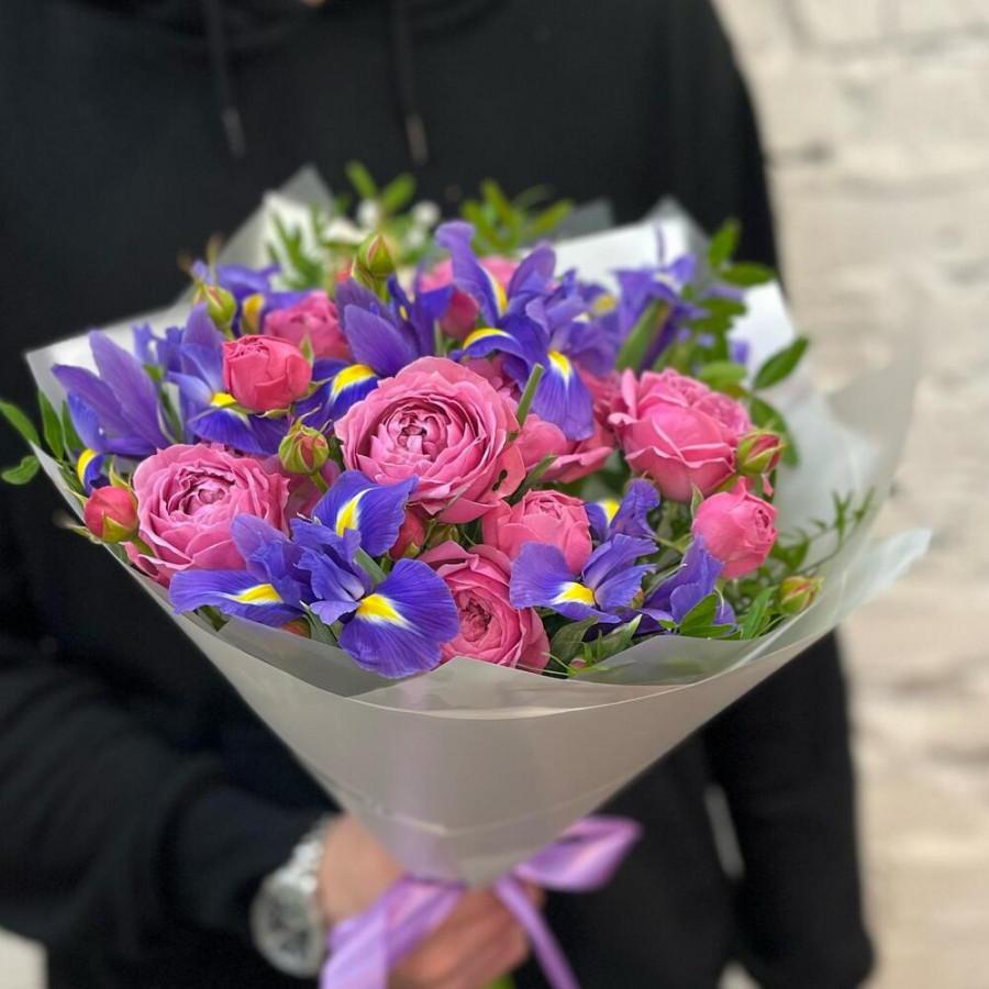Букет из розовых пионовидных роз и синих ирисов в Переславле-Залесском