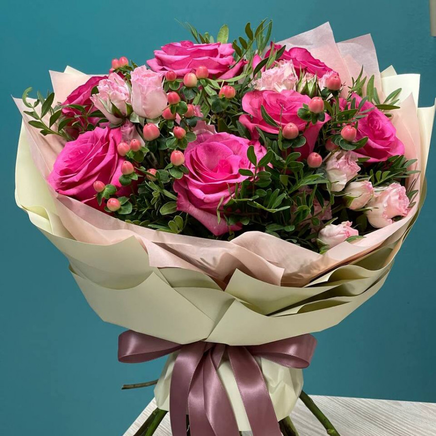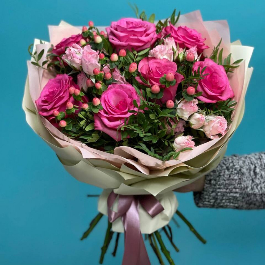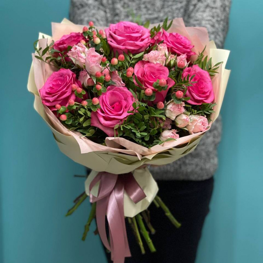 На фото букет из роз и гиперикума. В составе: роза 7 шт, кустовая роза 3 шт, гиперикум 4 шт, писташ 7 шт, . Все цветы свежие и ароматные, букет красиво оформлен и отлично подходит для подарка. Доступна доставка цветов или самовывоз.