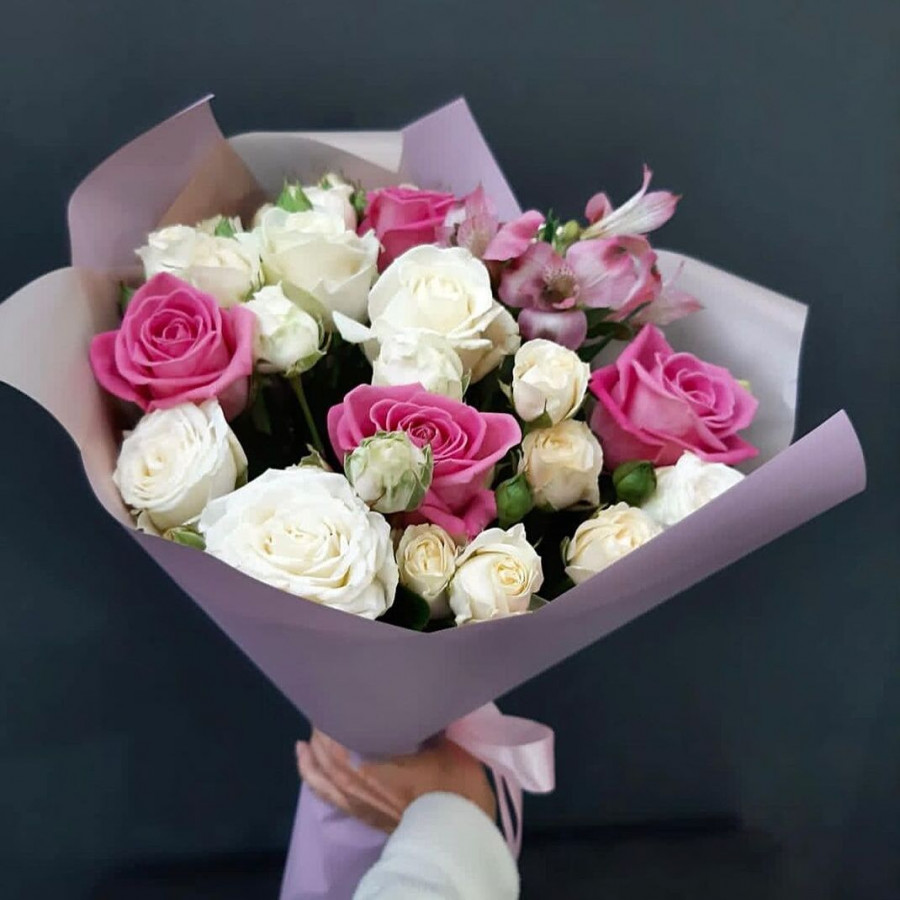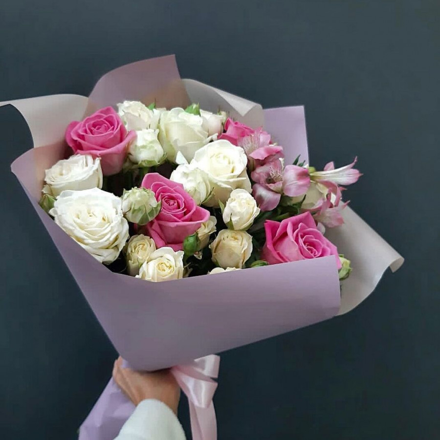 На фото букет из розовых роз и альстромерий. В составе: роза 5 шт, альстромерия 1 шт, кустовая роза 3 шт, крафт-бумага 1 шт, . Все цветы свежие и ароматные, букет красиво оформлен и отлично подходит для подарка. Доступна доставка цветов или самовывоз.