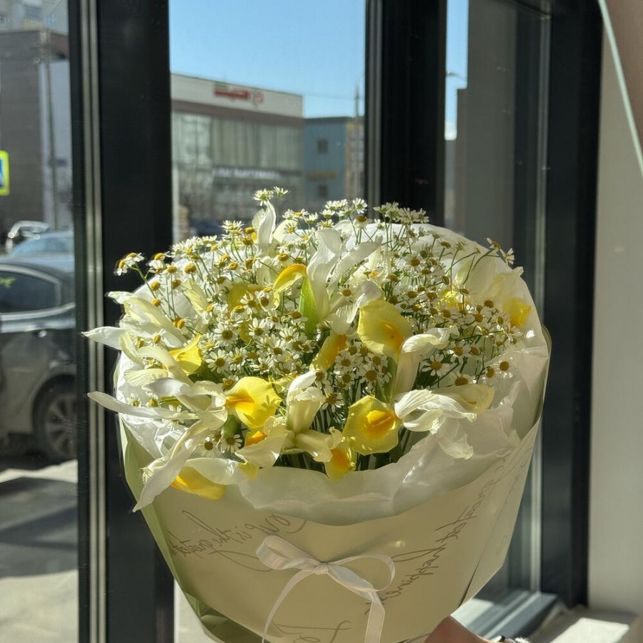 Букет из желтых ирисов и ромашек в Переславле-Залесском