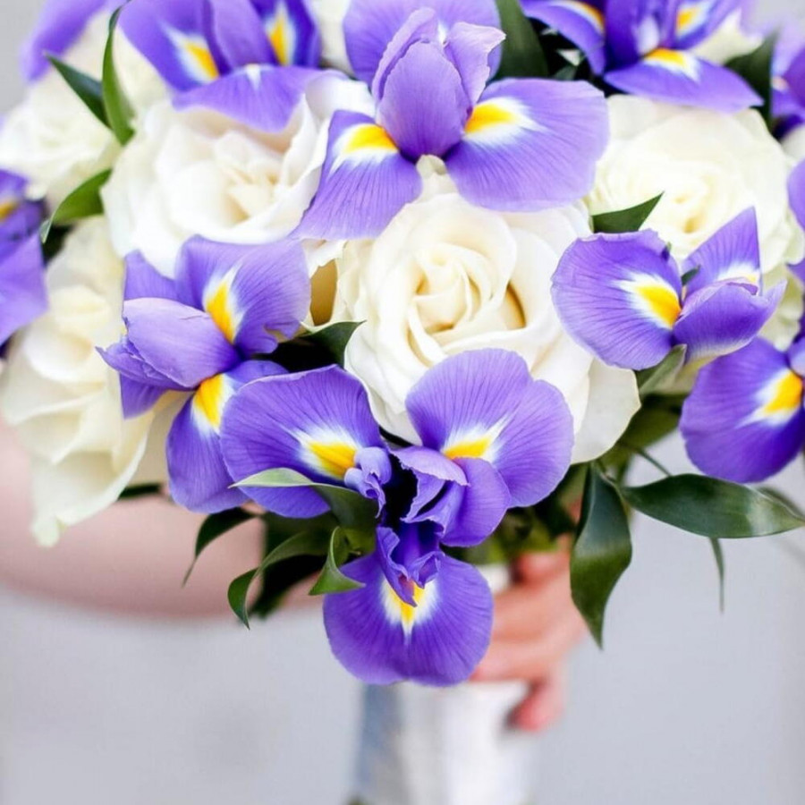 На фото букет невесты из белых роз и ирисов. В составе: ирис 17 шт, роза 12 шт, рускус 8 шт, атласная лента 1 шт, . Все цветы свежие и ароматные, букет красиво оформлен и отлично подходит для подарка. Доступна доставка цветов или самовывоз.
