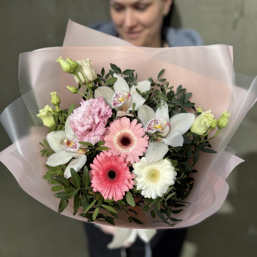 На фото букет «нежный роман». В составе: орхидея 3 шт, эустома (лизиантус) 1 шт, гербера 3 шт, писташ 5 шт, дизайнерская упаковка 1 шт, атласная лента 1 шт, . Все цветы свежие и ароматные, букет красиво оформлен и отлично подходит для подарка. Доступна доставка цветов или самовывоз.