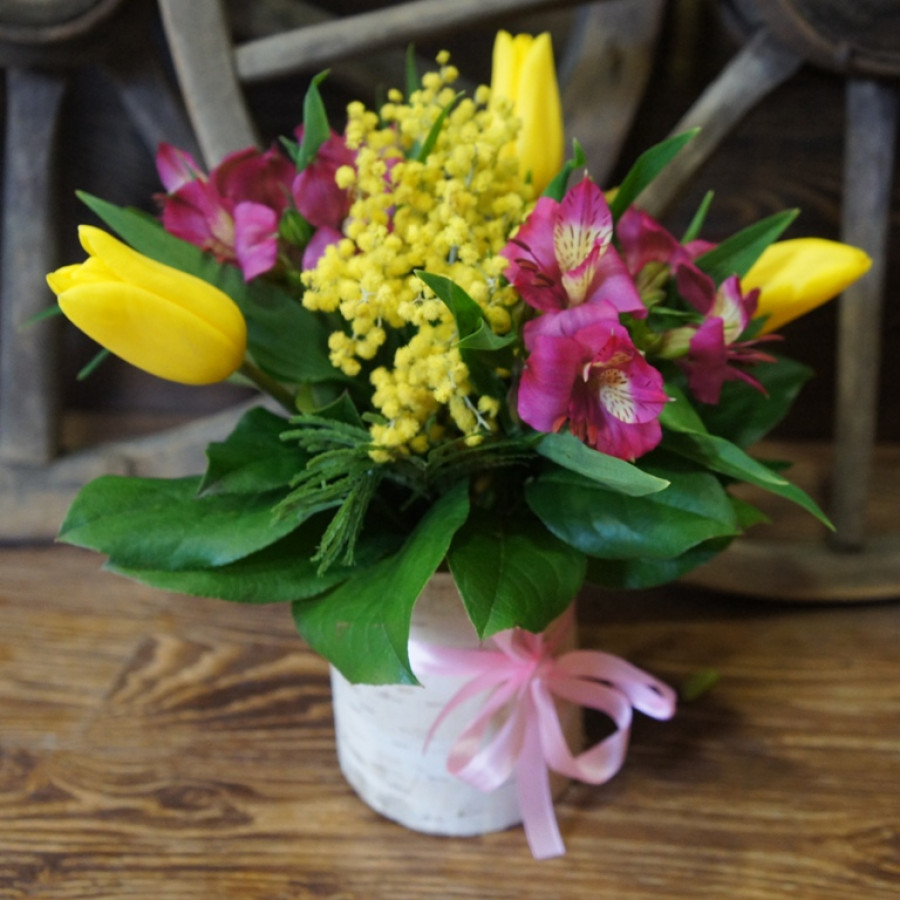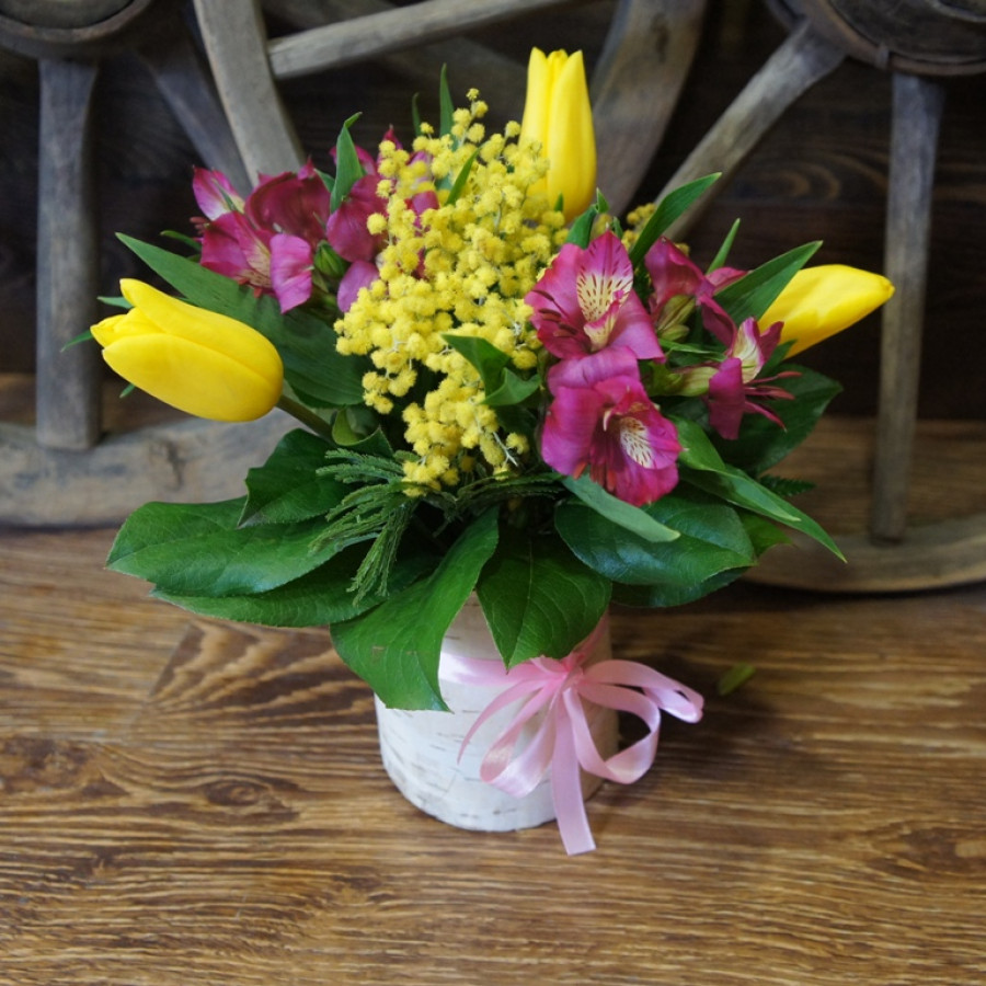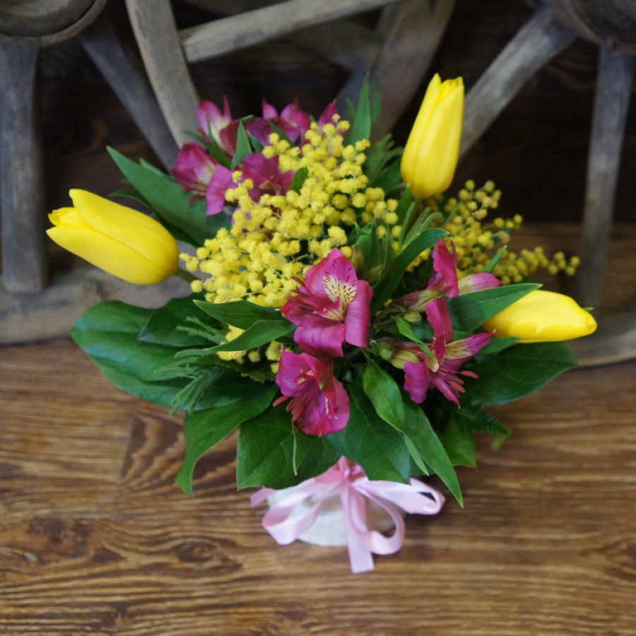Цветы – это превосходный и уместный подарок на любой праздник, торжество или знаменательное событие. А оригинальная и небанальная композиция – это гарантированный успех Вашего приветствия. Закажите «Шепот грез», состоящий из симпатичных тюльпанов, утонченных альстромерий, ярких вкраплений мимозы и зеленого папоротника – сделайте необычный сюрприз дорогим сердцу людям по очень доступной цене.