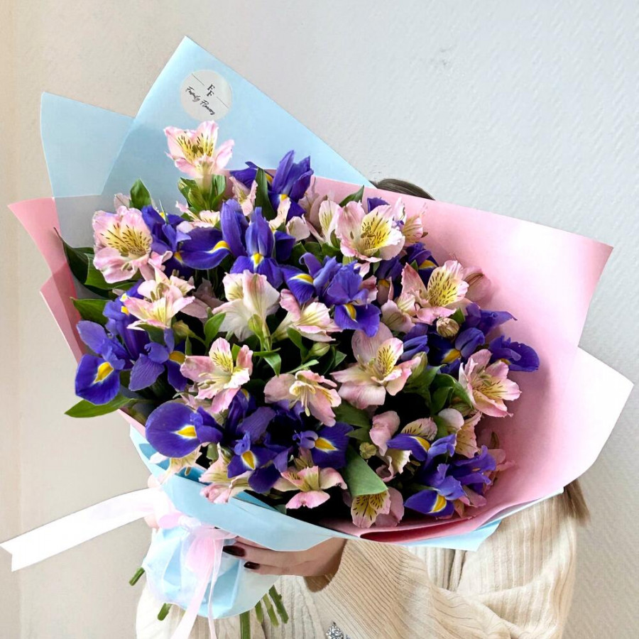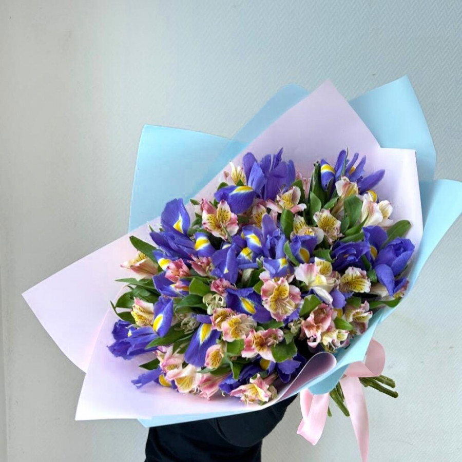 На фото букет «синие дали». В составе: ирис 15 шт, альстромерия 10 шт, дизайнерская упаковка 1 шт, атласная лента 1 шт, . Все цветы свежие и ароматные, букет красиво оформлен и отлично подходит для подарка. Доступна доставка цветов или самовывоз.