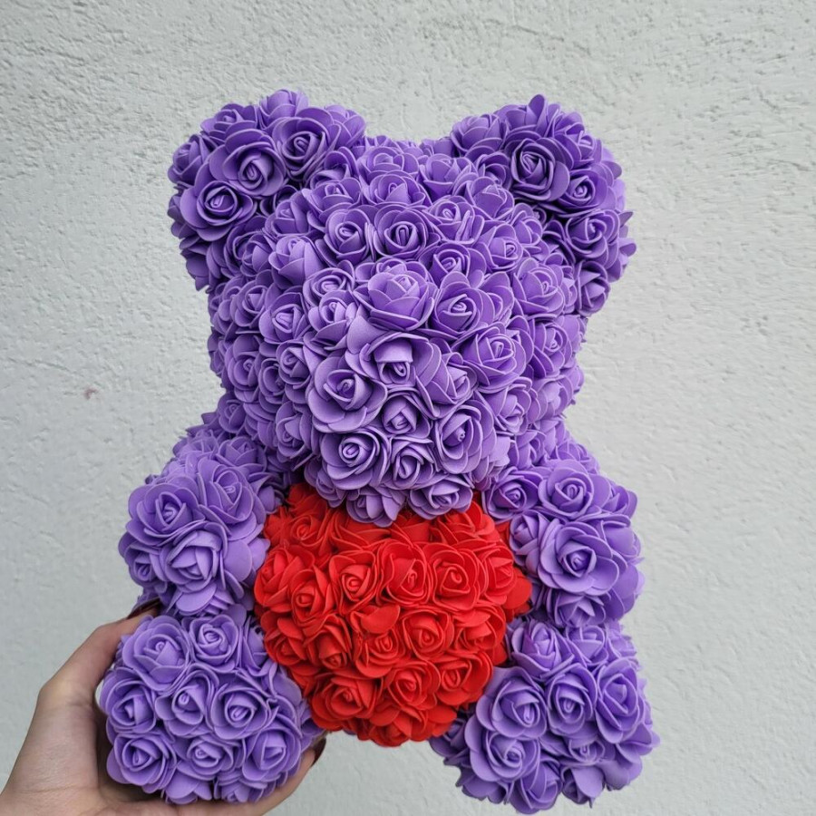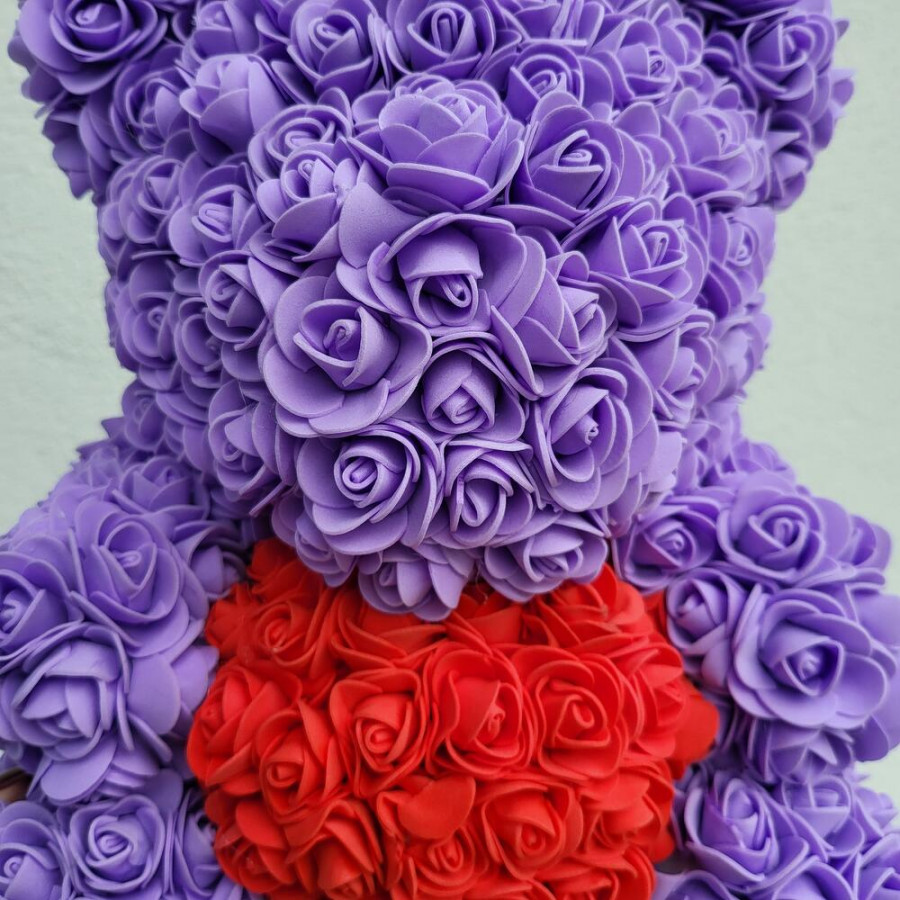 На фото фиолетовый мишка из роз. В составе: . Все цветы свежие и ароматные, букет красиво оформлен и отлично подходит для подарка. Доступна доставка цветов или самовывоз.
