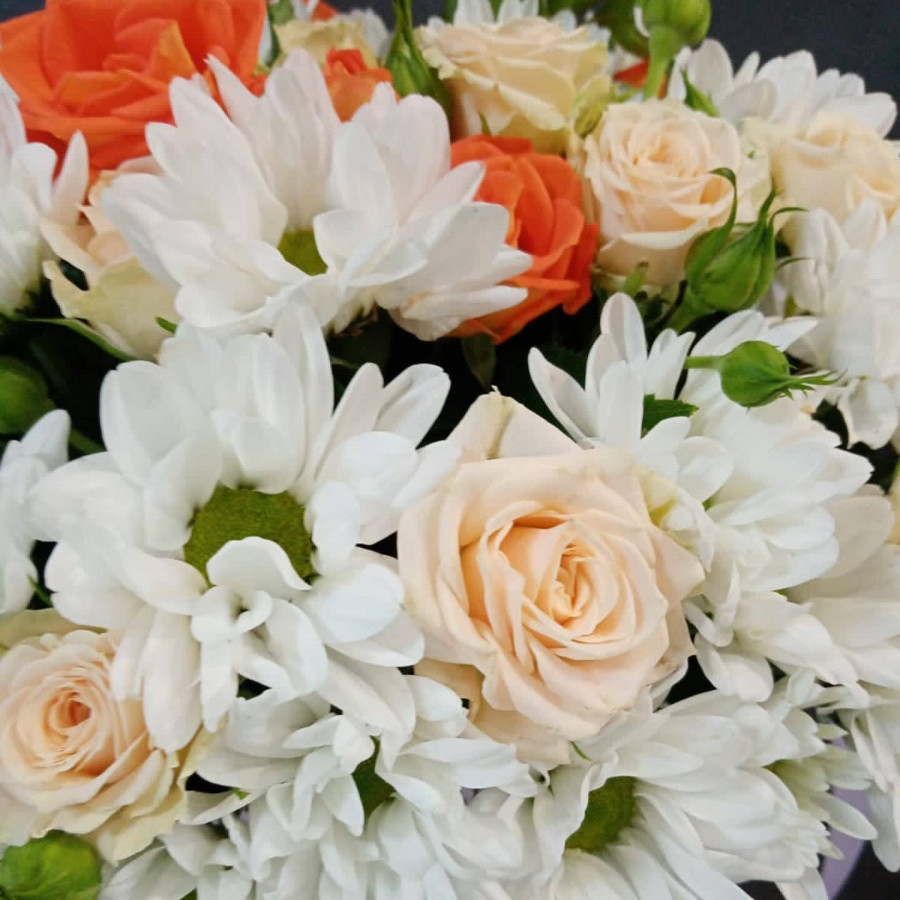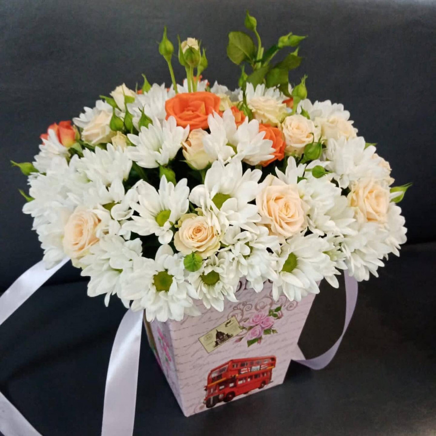 На фото композиция из кустовой розы и хризантемы. В составе: хризантема кустовая 7 шт, кустовая роза 5 шт, коробка (s) 1 шт, . Все цветы свежие и ароматные, букет красиво оформлен и отлично подходит для подарка. Доступна доставка цветов или самовывоз.