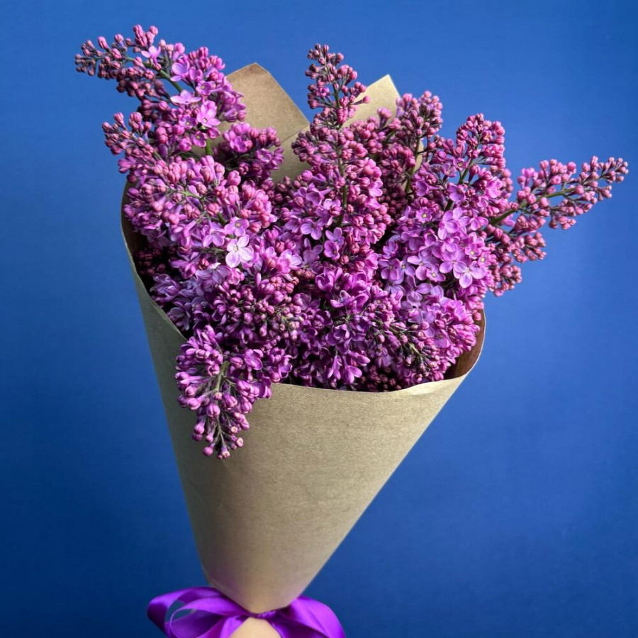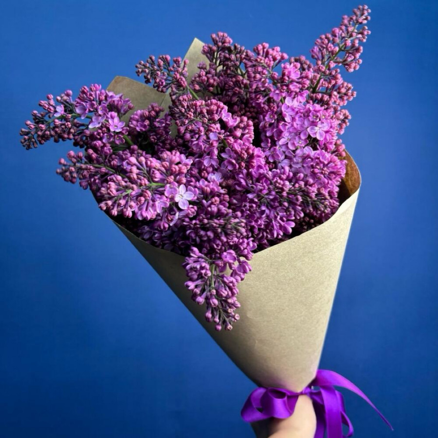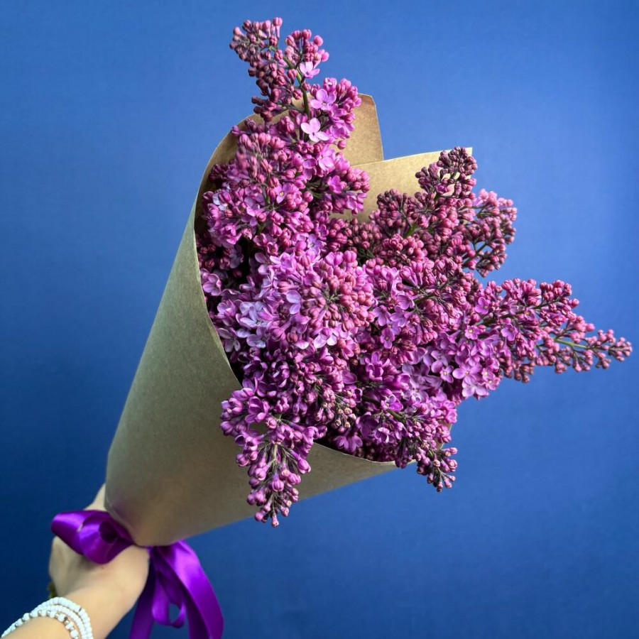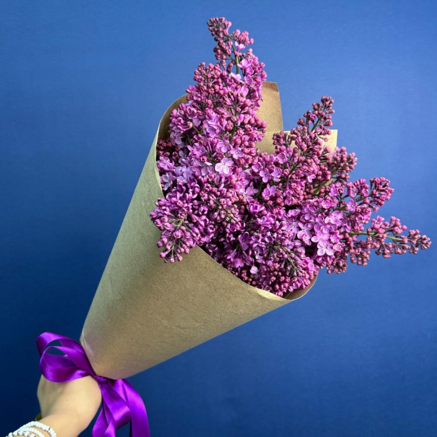 На фото маленький букет сирени. В составе: сирень 5 шт, крафт-бумага 1 шт, атласная лента 1 шт, . Все цветы свежие и ароматные, букет красиво оформлен и отлично подходит для подарка. Доступна доставка цветов или самовывоз.