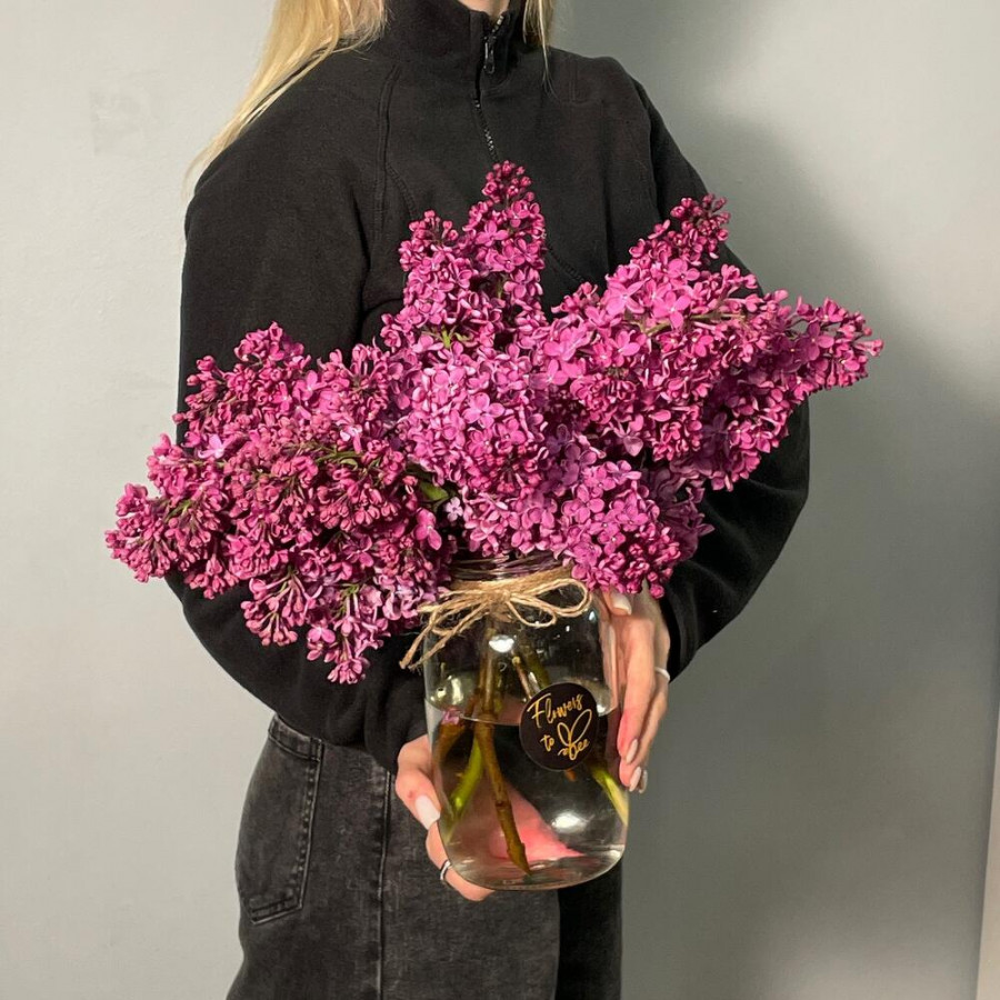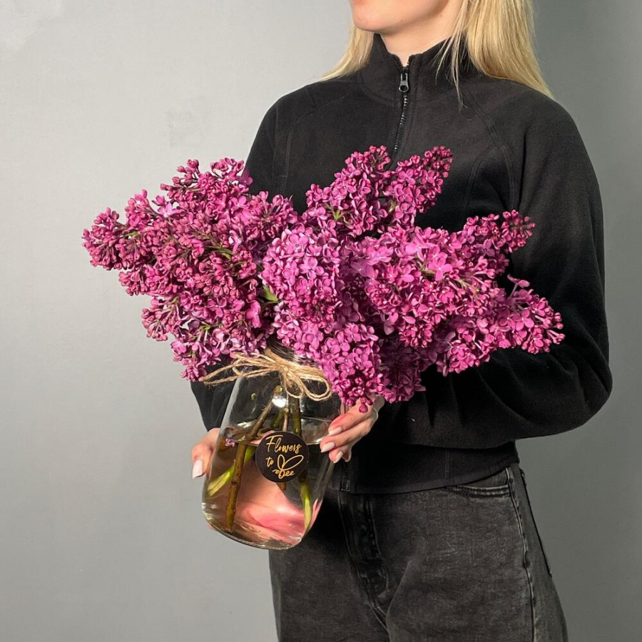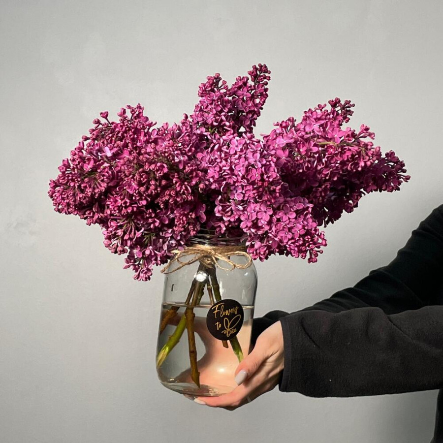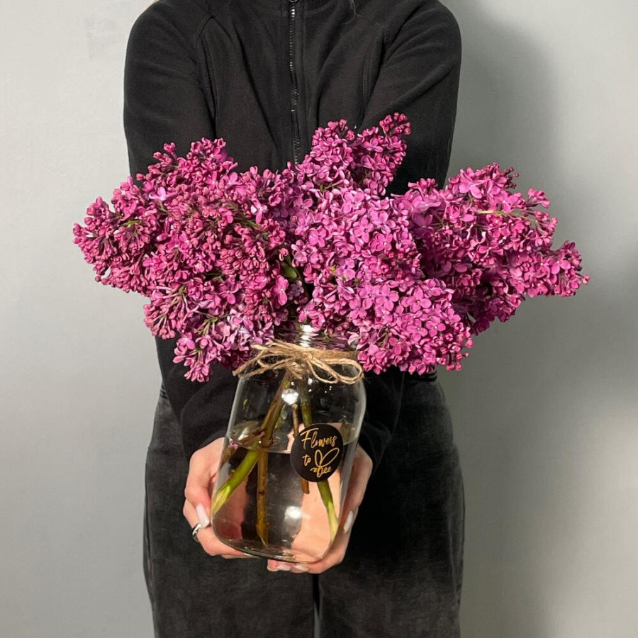На фото букет сирени в вазе. В составе: сирень 5 шт, стеклянная ваза (s) 1 шт, атласная лента 1 шт, . Все цветы свежие и ароматные, букет красиво оформлен и отлично подходит для подарка. Доступна доставка цветов или самовывоз.